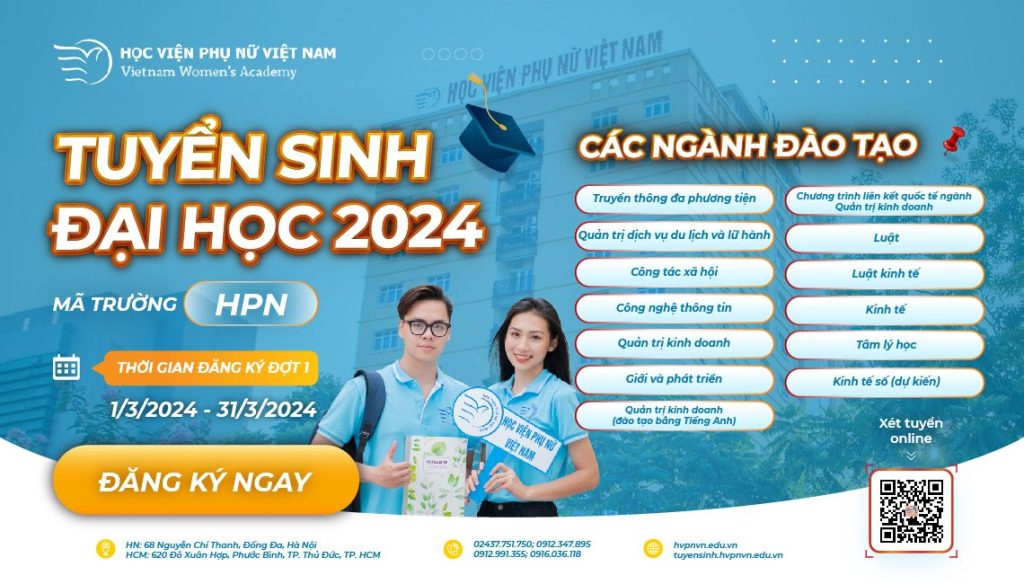 Học viện Phụ nữ Việt Nam (Học viện) là cơ sở giáo dục đại học công lập đạt chuẩn kiểm định chất lượng giáo dục quốc gia. Năm 2024, Học viện Phụ nữ Việt Nam thông báo tuyển sinh 1.590 chỉ tiêu dành cho 11 ngành đại học chính quy bao gồm: Ngành Quản trị kinh doanh; Luật; Luật kinh tế; Công nghệ thông tin; Công tác xã hội; Giới và phát triển; Quản trị Dịch vụ Du lịch và lữ hành; Truyền thông đa phương tiện; Kinh tế; Tâm lý học, Kinh tế số (dự kiến).