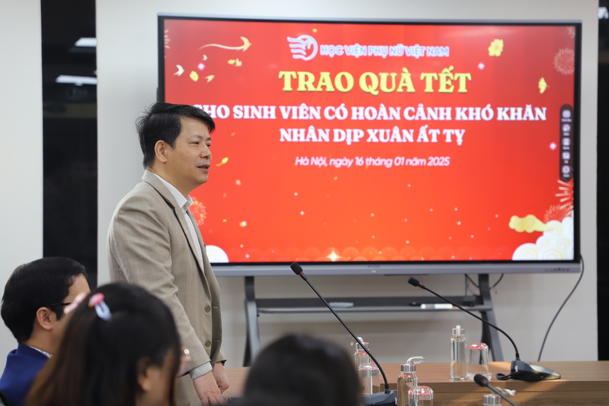 Trong khuôn khổ chương trình, PGS.TS Trần Quang Tiến và NCS.ThS. Bùi Gia Huân đã đại diện Học viện trao tặng các suất quà Tết đến sinh viên. PGS.TS Trần Quang Tiến phát biểu: “Học viện luôn mong muốn tạo điều kiện tốt nhất để sinh viên có hoàn cảnh khó khăn yên tâm học tập, không cảm thấy bị bỏ lại phía sau. Chúng tôi hy vọng rằng những món quà nhỏ bé này sẽ giúp các em có một cái Tết ấm áp hơn, đồng thời cũng là lời động viên các em tiếp tục nỗ lực, phấn đấu trong học tập và cuộc sống.”