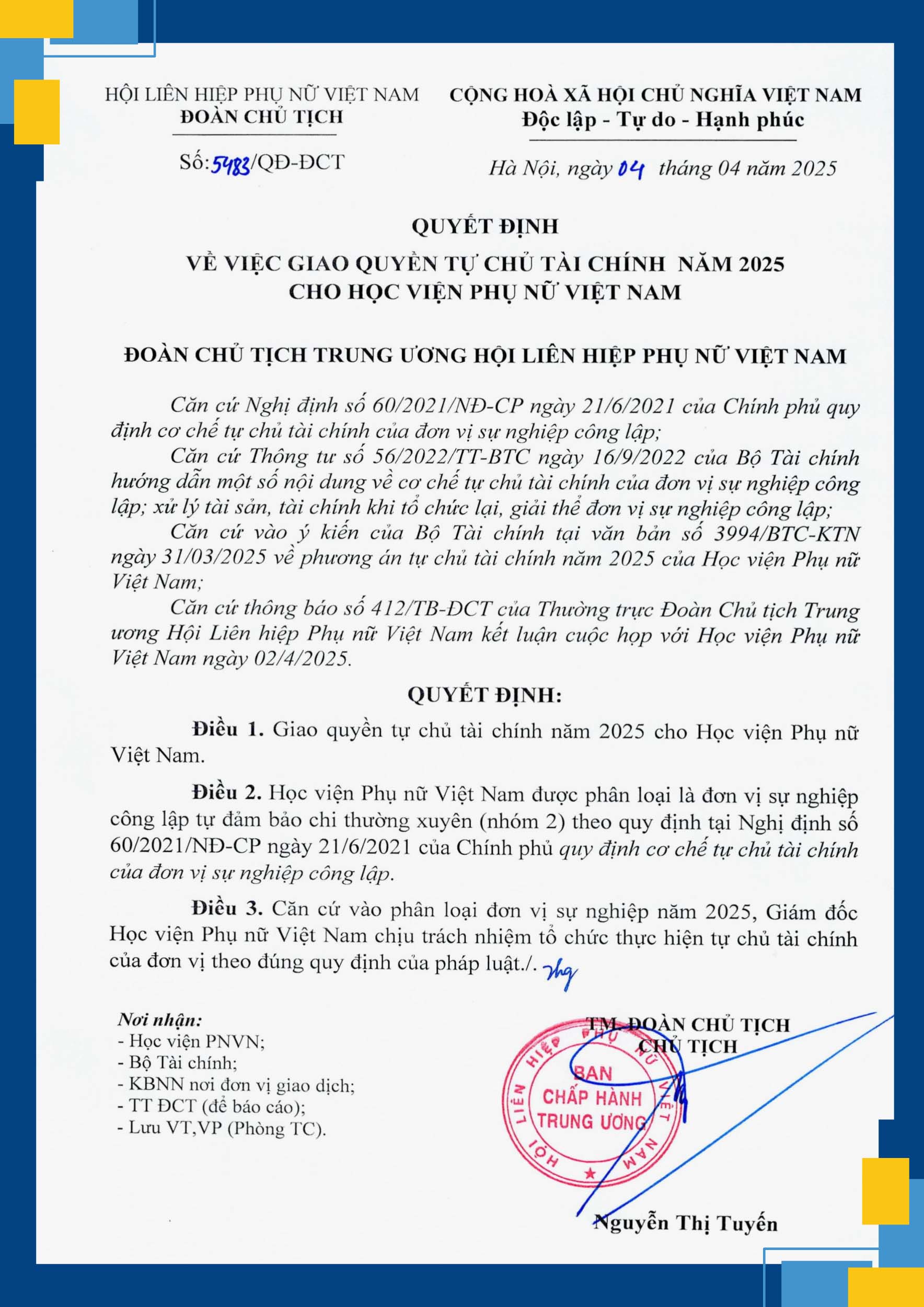 Tự chủ tài chính không chỉ trao quyền, mà còn đi kèm với trách nhiệm cao hơn của đơn vị được giao quyền. Theo Điều 3 của Quyết định 5483/QĐ-ĐCT, Giám đốc Học viện Phụ nữ Việt Nam là người chịu trách nhiệm tổ chức thực hiện việc tự chủ tài chính theo đúng quy định pháp luật. Điều này đòi hỏi Học viện phải tăng cường năng lực quản trị, minh bạch trong hoạt động tài chính và đảm bảo hiệu quả trong sử dụng nguồn lực.