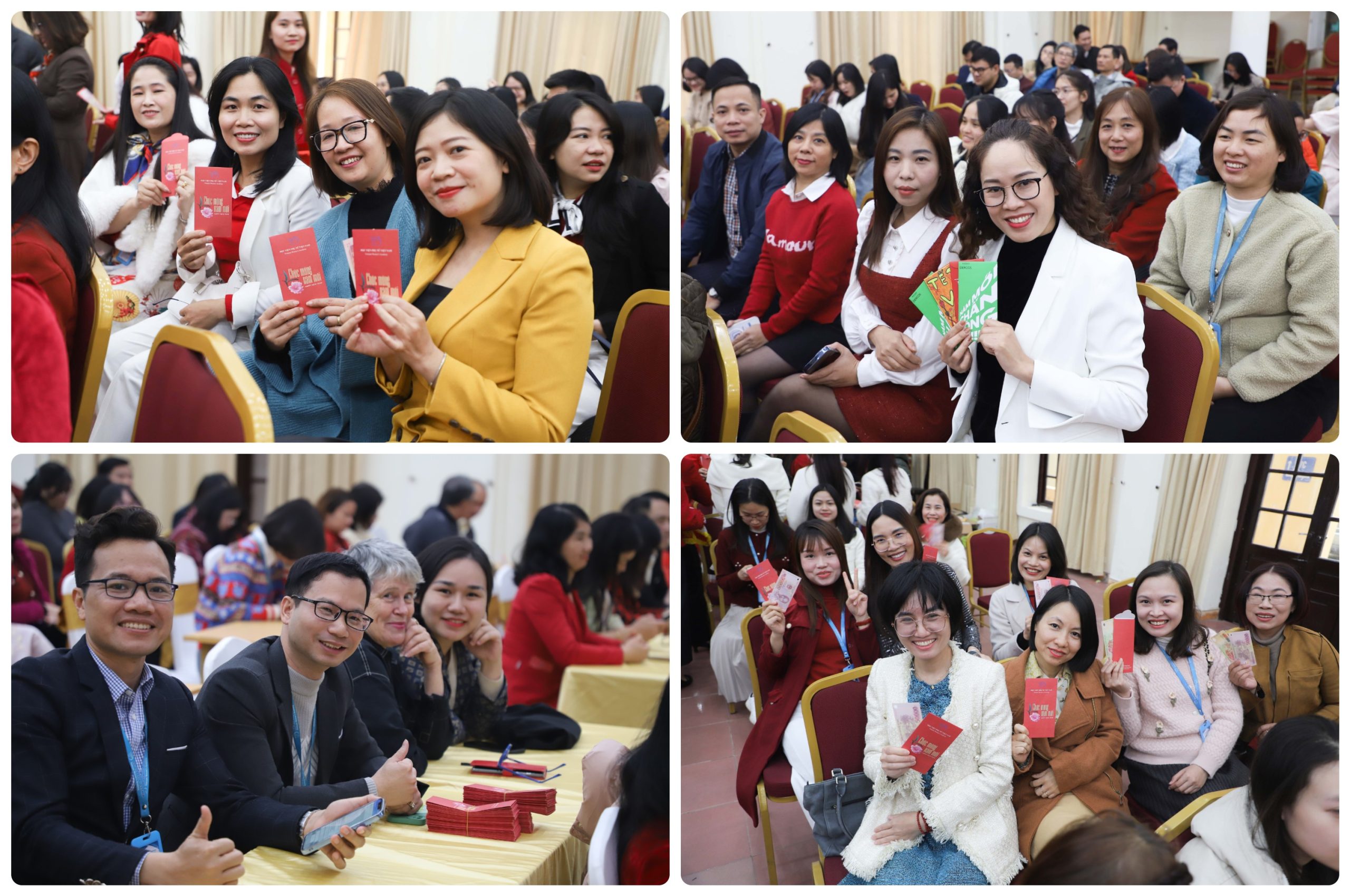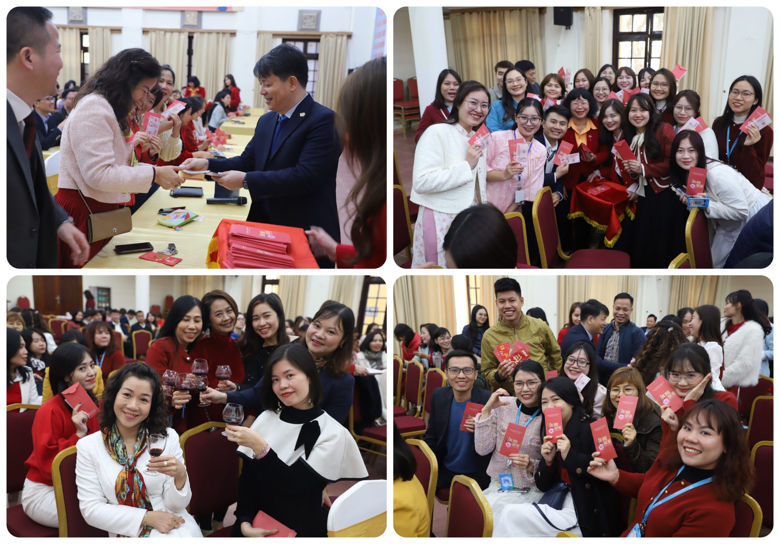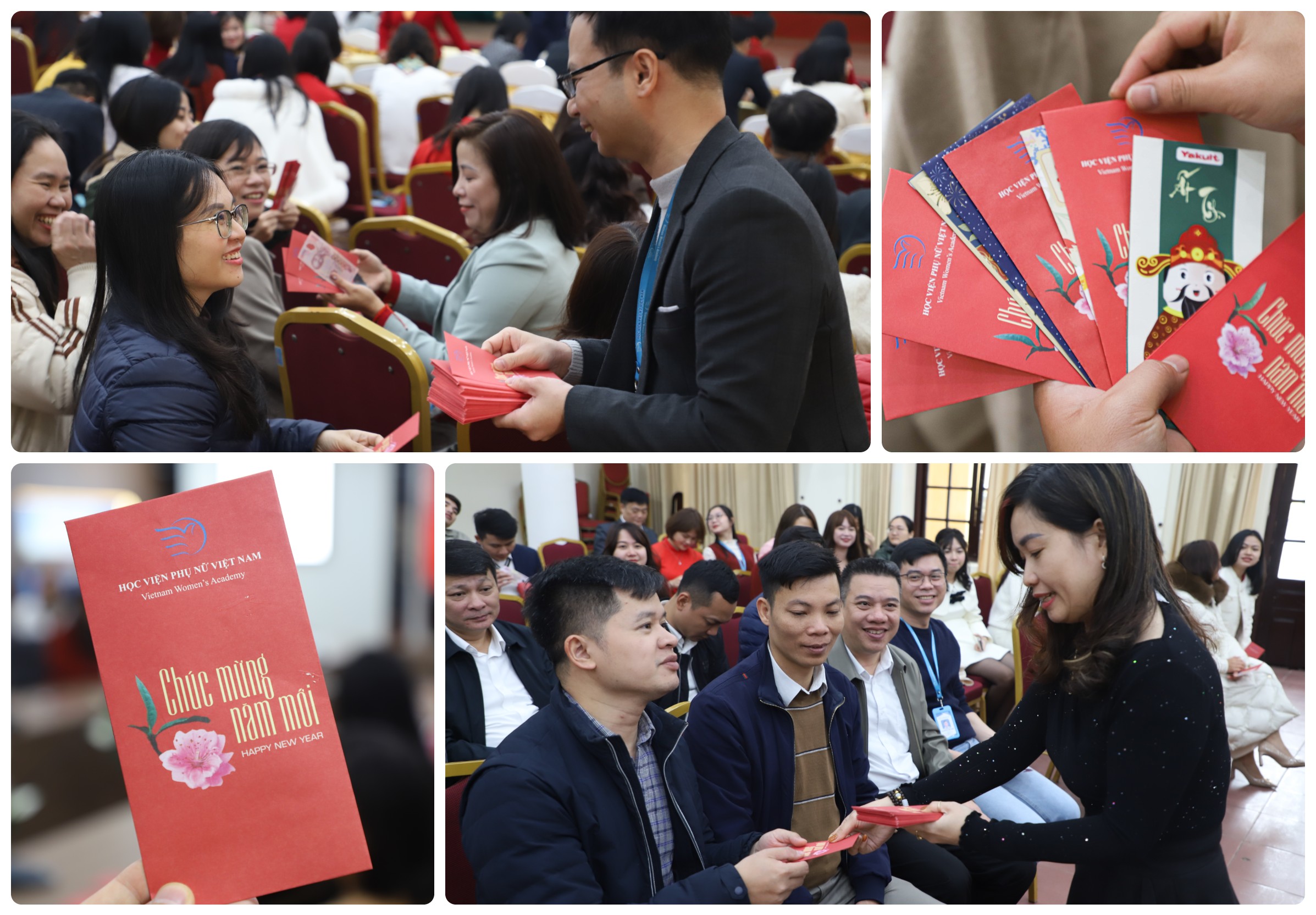 Ban Giám đốc Học viện đã trao những bao lì xì may mắn đến viên chức, người lao động như một lời chúc tốt đẹp đầu năm. Công đoàn Học viện cũng gửi tặng lì xì đến công đoàn viên, thể hiện sự quan tâm và động viên tinh thần. Các đơn vị trong Học viện đã gặp gỡ, chúc Tết nhau và cùng trao đổi về mục tiêu, kế hoạch phát triển trong năm mới, hướng tới nâng cao chất lượng đào tạo, nghiên cứu khoa học và hỗ trợ sinh viên. Các cuộc trao đổi xoay quanh việc đổi mới phương pháp giảng dạy, tăng cường ứng dụng công nghệ trong giáo dục, cũng như mở rộng cơ hội hợp tác với các tổ chức trong và ngoài nước. Những cam kết, kế hoạch được đề ra hứa hẹn sẽ mang lại những bước tiến vững chắc cho từng đơn vị và Học viện trong năm Ất Tỵ.