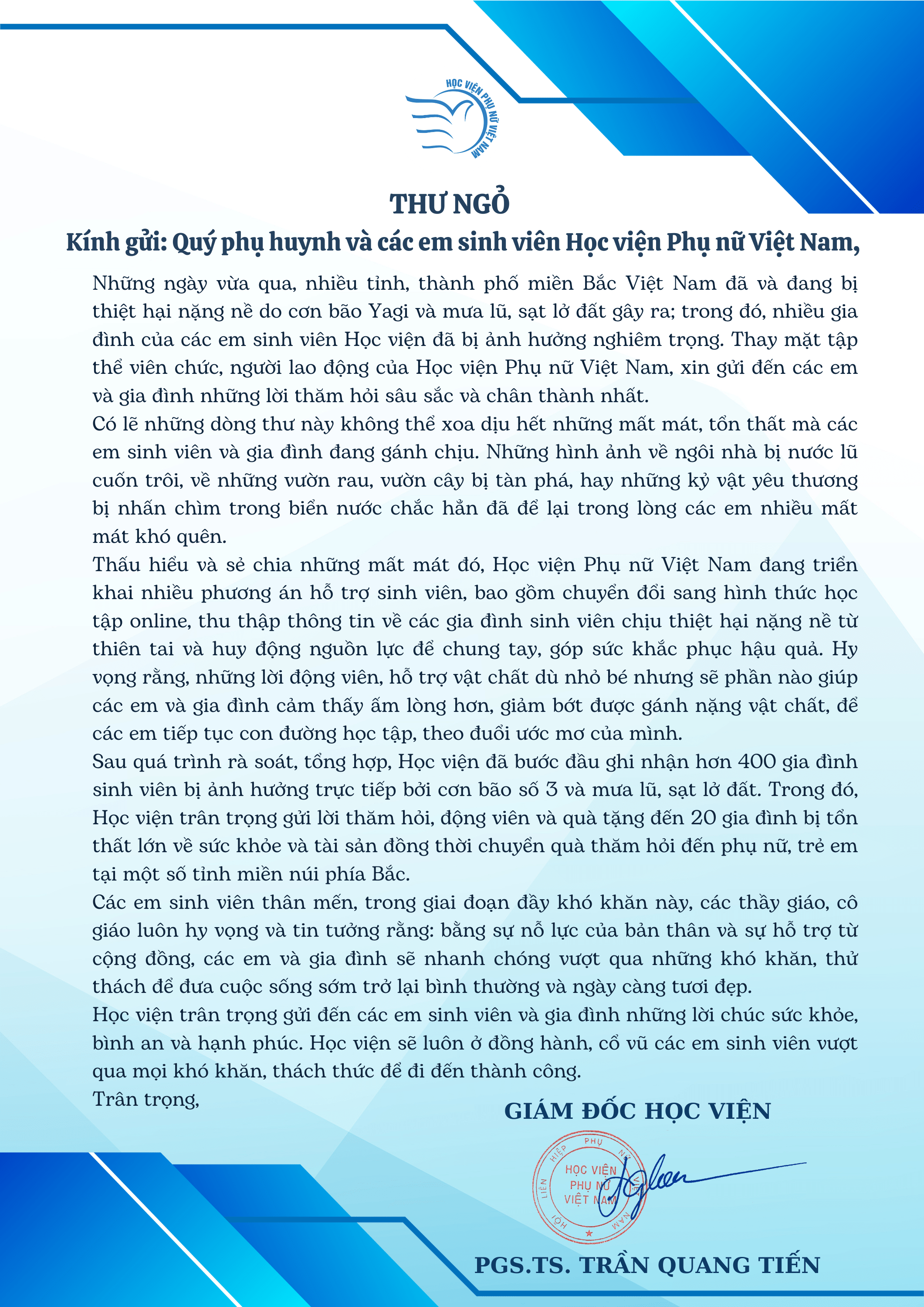Thư ngỏ của PGS.TS. Trần Quang Tiến - Bí thư Đảng ủy, Giám đốc Học viện Phụ nữ Việt Nam gửi tới Quý phụ huynh và các em sinh viên Học viện Phụ nữ Việt Nam chịu ảnh hưởng, thiệt hại do cơn bão Yagi gây ra.