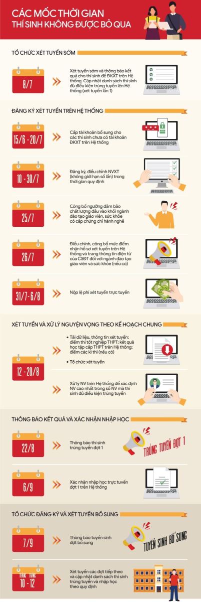 Theo đó, thí sinh diện tuyển thẳng và ưu tiên xét tuyển nộp hồ sơ trước 30/6, nhận kết quả trước 5/7 và xác nhận nhập học trên hệ thống tuyển sinh của Bộ trước 17h ngày 15/8.