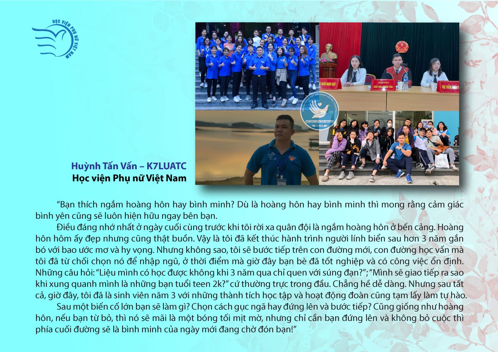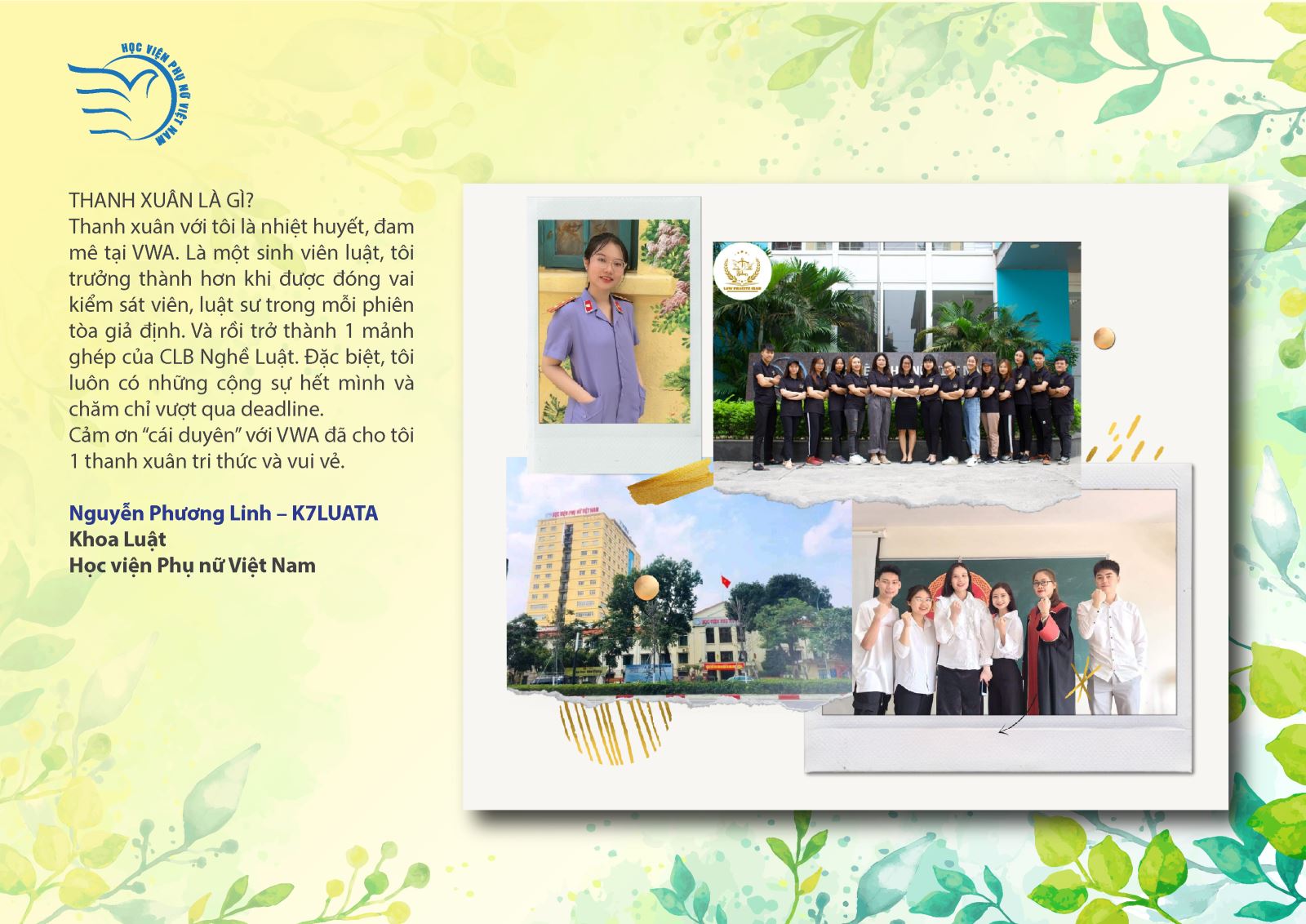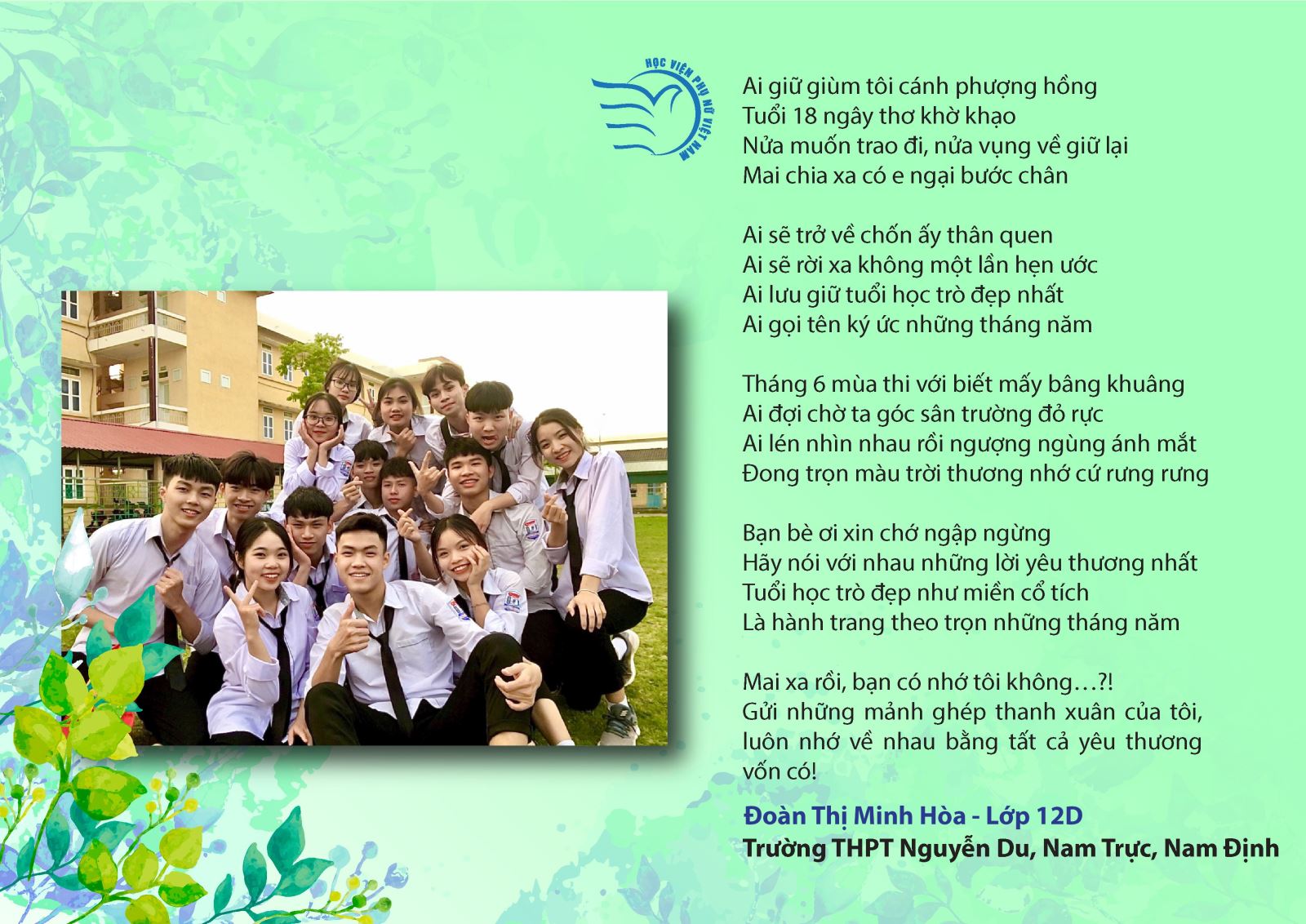 Các bạn sinh viên của Học viện Phụ nữ Việt Nam và sinh viên trường đại học khác gửi bài dự thi về những cảm xúc cuộc cuộc sống sinh viên; Ngôi trường VWA thân thương; Những giờ giảng của thầy cô và cả những cảm xúc khi phải tạm biệt trường lớp. Các tác phẩm dự thi của các bạn học sinh chia sẻ về những kỉ niệm tuổi học trò; Giây phút sắp chia xa của học sinh cuối cấp; Những ước mơ của hành trình sắp tới; Những cảm xúc khó nói thành lời trực tiếp đối với thầy cô, cha mẹ…