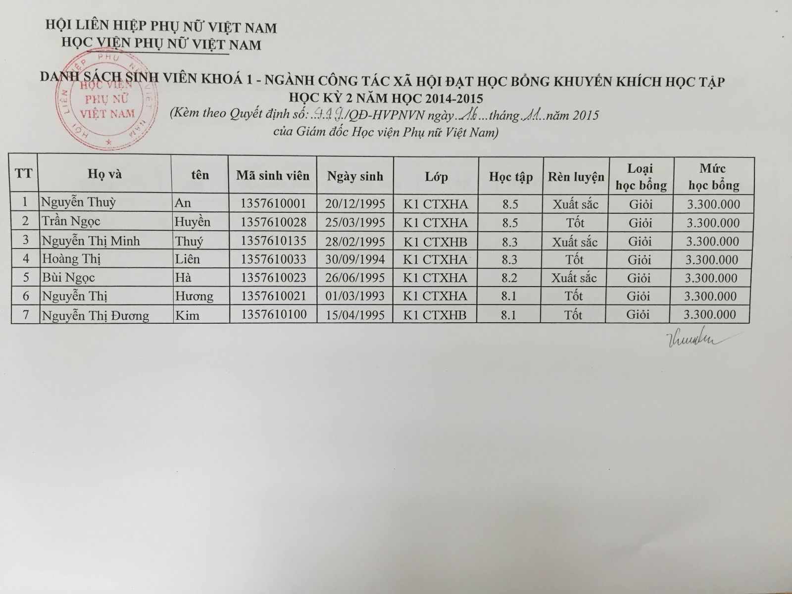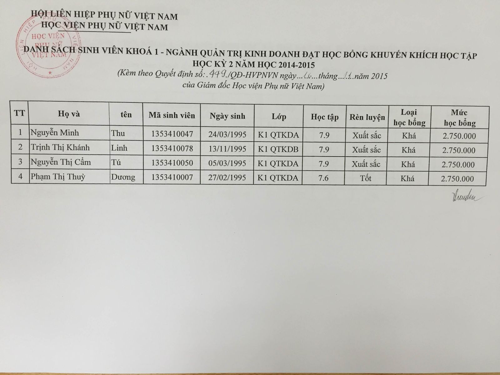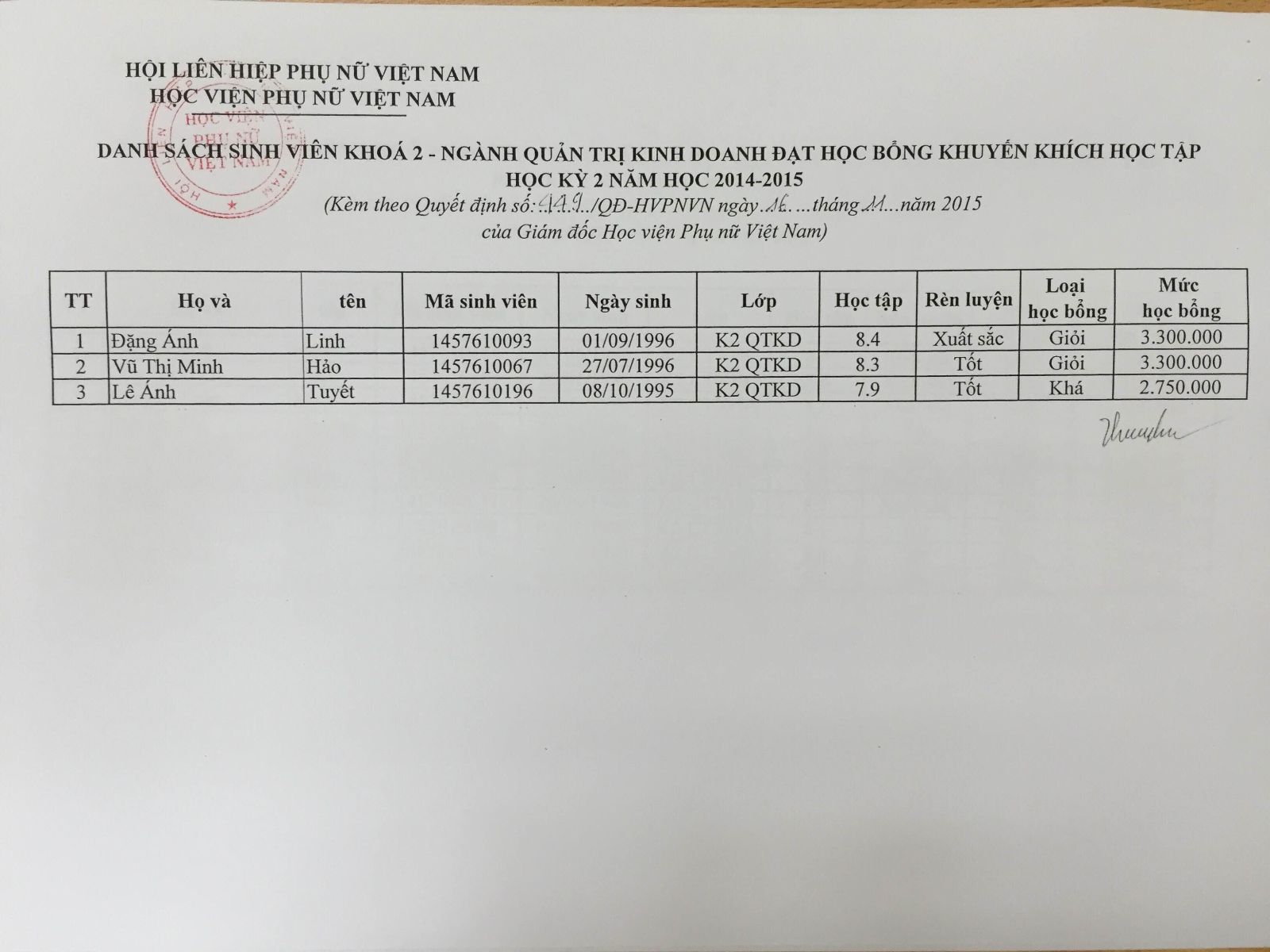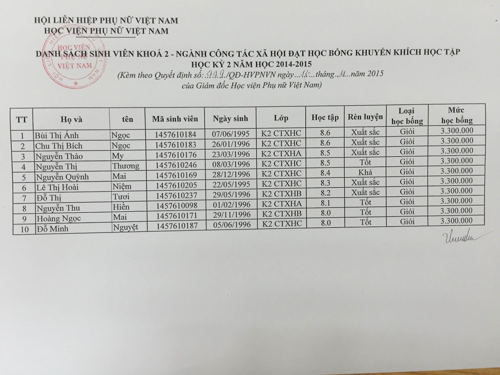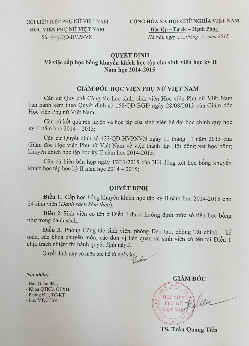 Danh sách sinh viên đạt học bổng khuyến khích học tập học kỳ 2 năm học 2014-2015