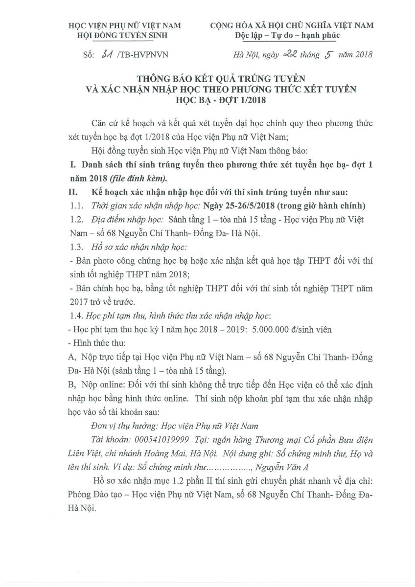 Tin tứcDANH SÁCH THÍ SINH TRÚNG TUYỂN ĐỢT I NĂM 2018 (Theo hình thức xét học bạ) Posted on Tháng Năm 22, 2018 by admin(full) 22 Th5 Mời bạn đọc xem Danh sách thí sinh trúng tuyển đợt I theo hình thức xét học bạ TẠI ĐÂY admin(full) Học viện Phụ nữ Việt Nam công bố danh sách trúng tuyển đại học chính quy đợt I 2018Đảng bộ Học viện Phụ nữ Việt Nam tổ chức hội nghị sinh hoạt chuyên đề