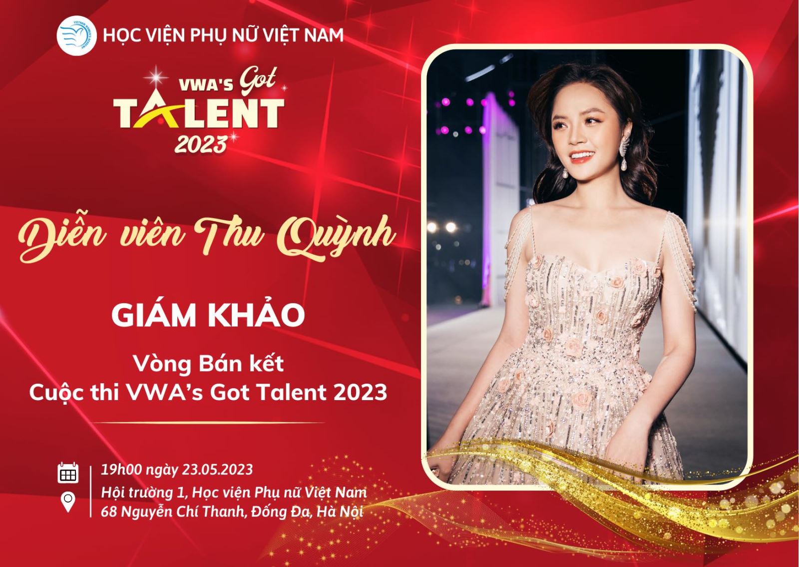 Với sự quý mến dành cho các bạn sinh viên, diễn viên Thu Quỳnh đã nhận lời đồng hành cùng Top 25 thí sinh tại Vòng Bán kết VWA’s Got Talent tới đây. Với những kinh nghiệm dày dặn trong lĩnh vực nghệ thuật, chắc chắn diễn viên Thu Quỳnh sẽ đem đến những chia sẻ, nhận xét góp ý cho các bạn thí sinh và công tâm lựa chọn ra top những thí sinh xuất sắc nhất lọt vào vòng Chung kết