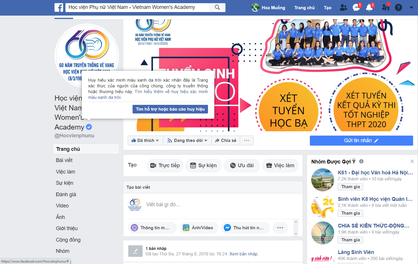 Ngày 6/8/2020, Facebook đã gửi thông báo đến email chính thức của học viện công bố về việc cấp tick xanh cho trang fanpage Học viện Phụ nữ Việt Nam – Vietnam Women’s Academy. Đây là sự khẳng định uy tín, tầm ảnh hưởng của Học viện đối với cộng đồng. Không chỉ vậy, với biểu tượng tick xanh fanpage này, Học viện Phụ nữ Việt Nam sẽ có thêm nhiều cơ hội lan tỏa thông tin, tăng lượng tương tác thúc đẩy sự thành công của các mục tiêu truyền thông đã đặt ra theo lộ trình.