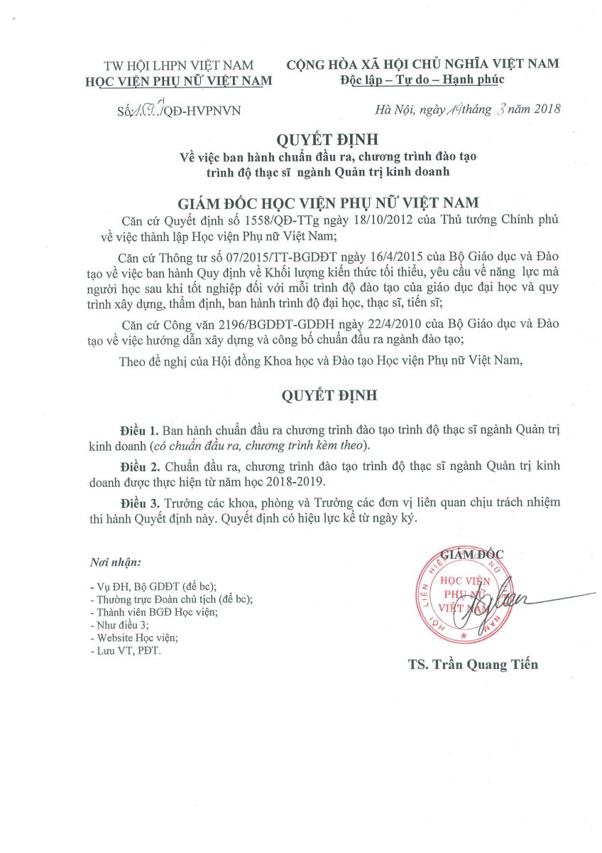 Tin tứcHọc viện Phụ nữ Việt Nam công bố chuẩn đầu ra, chương trình đào tạo thạc sĩ ngành Quản trị kinh doanh Posted on Tháng Tư 12, 2018 by admin(full) 12 Th4 Mời bạn đọc xem nội dung chuẩn đầu ra và chương trình đào tạo thạc sỹ ngành QTKD TẠI ĐÂY admin(full) Kết quả đánh giá rèn luyện sinh viên HK I năm học 2017 – 2018 Thư mời viết bài Hội thảo khoa học Quốc tế “Doanh nghiệp nữ trong Cách mạng công nghiệp 4.0”