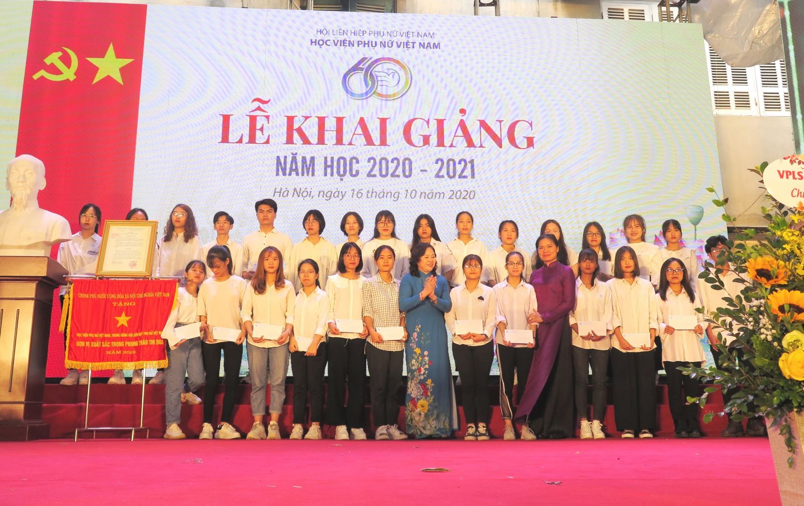 CT Hội LHPN Việt Nam Hà Thị Nga (áo dài tím) và Thứ trưởng Bộ GD & ĐT Ngô Thị Minh (áo dài xanh) trao học bổng cho tân sinh viên của Học viện năm học 2020 – 2021