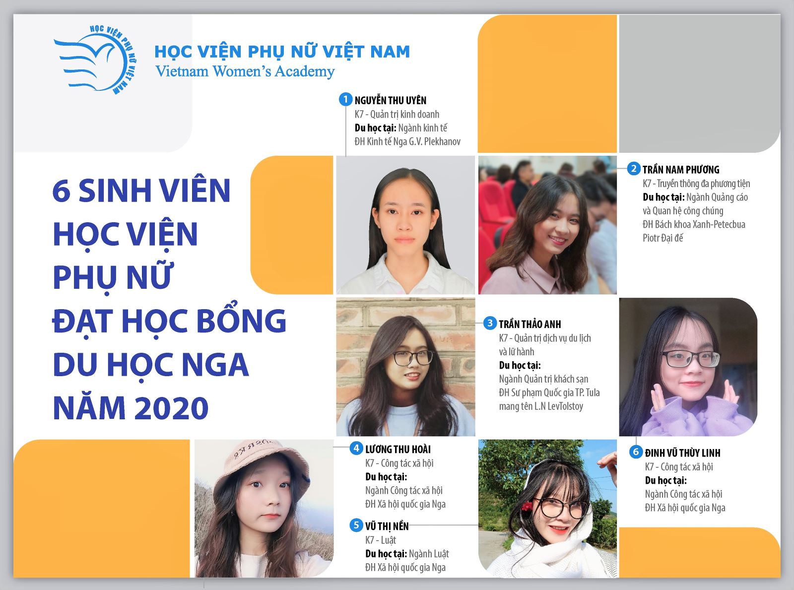 Năm học 2020-2021 là một năm học đầy thách thức không chỉ đối với thầy và trò của Học viện Phụ nữ Việt Nam mà còn là năm học đầy khó khăn đối với cả nước trong bối cảnh dịch bệnh hết sức phức tạp và khó lường. Không chịu lùi bước trước khó khăn, 06 bông hồng của Học viện Phụ nữ Việt Nam đã đặt chân đến xứ sở bạch dương xinh đẹp với 06 học bổng toàn phần Liên Bang Nga 2020. Tiếp nối truyền thống đó Học viện vẫn liên tục cập nhật thông tin kịp thời, nuôi dưỡng và ươm mầm những ước mơ cho năm học 2021-2022. Đền đáp xứng đáng cho những nỗ lực và cố gắng không ngừng nghỉ của thầy và trò, các ứng cử viên do Học viện cử đi liên tiếp nhận được thông báo về kết quả trúng tuyển học bổng toàn phần các bậc học đại học và thạc sĩ cho năm học mới này. Hãy cùng chúng tôi điểm danh những gương mặt xuất sắc này nhé: