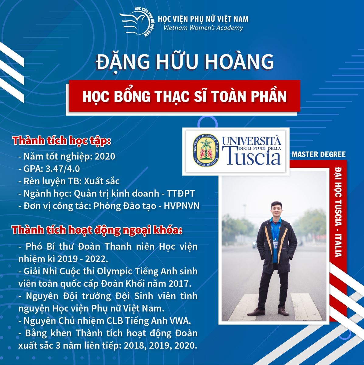 Tốt nghiệp loại Giỏi ngành Quản trị kinh doanh tại Học viện Phụ nữ Việt Nam và được trải nghiệm thực tiễn từ khi còn là sinh viên, Hữu Hoàng tự tin nộp đơn xin làm việc tại Học viện. Chàng đội trưởng đội thanh niên tình nguyện Học viện chỉ dám mơ về một cơ hội được đi du lịch để ngắm màu trời, màu biển Địa Trung Hải và màu xanh thiên thanh của đội tuyển bóng đá Ý sau quá trình đi làm, tích luỹ tài chính. Vậy nhưng, ước mơ cứ lớn dần và rõ nét hơn khi Hữu Hoàng làm việc tại Phòng Đào tạo của Học viện. Được tiếp nhận nhiều thông tin về giáo dục đào tạo và nhờ mạng lưới hợp tác quốc tế tại Học viện, Hoàng được biết đến Hội thảo du học trực tuyến của Đại sứ quán Ý tại Việt Nam và các trường đại học tại Ý; Tham khảo nhiều thông tin về học bổng, niềm đam mê khám phá và tích luỹ kiến thức lại trỗi dậy trong anh chàng cựu sinh viên ngành Quản trị kinh doanh, và đang chuẩn bị hoàn thành bằng đại học thứ 2 ngành Truyền thông đa phương tiện tại Học viện.
