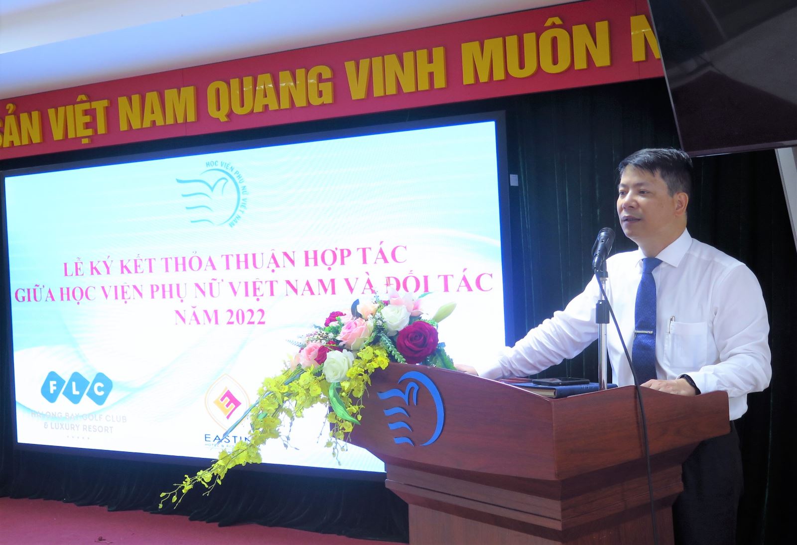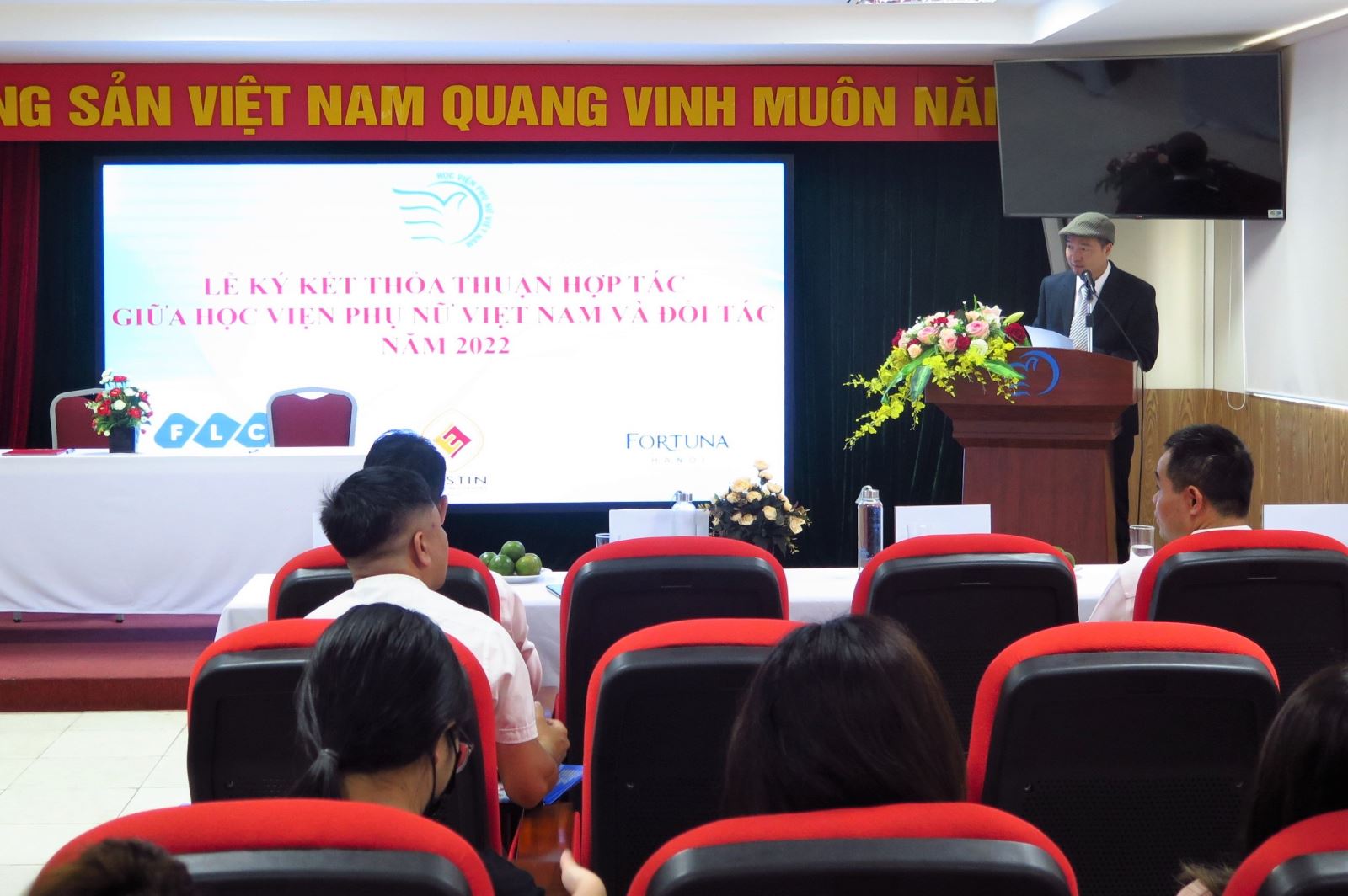Phát biểu khai mạc lễ ký kết, PGS.TS Trần Quang Tiến khẳng định, đứng trước sự thay đổi nhanh chóng của nhu cầu thị trường lao động các trường đại học nói chung và Học viện Phụ nữ Việt Nam nói riêng đã có những thay đổi từ nội dung, phương pháp, hình thức đào tạo đến các thức quản trị đại học. Với mục tiêu giáo dục toàn diện, chất lượng, bình đẳng, Học viện Phụ nữ Việt Nam đã ký kết trên 50 biên bản ghi nhớ hợp tác với các đơn vị, tổ chức doanh nghiệp trong và ngoài nước đồng thời không ngừng vận động nhằm thay đổi phương pháp dạy học hướng đến việc đào tạo sinh viên đáp ứng nguồn nhân lực chất lượng cao, phù hợp với nhu cầu xã hội. Đặc biệt, trong mối quan hệ hai chiều, dựa trên nền tảng nghiên cứu, giảng dạy, thực hành, Học viện Phụ nữ Việt Nam hi vọng sẽ tham gia tư vấn chiến lược, tư vấn quản lý, xây dựng chính sách,… để thúc đẩy sự phát triển của doanh nghiệp đối tác và nâng cao hiệu quả hợp tác giữa hai bên. Lễ ký kết hôm này là khởi đầu cho chuỗi các hoạt động phối hợp toàn diện từ: đào tạo, trao đổi sinh viên, thực tập, việc làm cho cho sinh viên giữa Học viện Phụ nữ Việt Nam và các đơn vị đối tác. Đặc biệt, trước khi ký kết hợp tác, các doanh nghiệp đã hỗ trợ tiếp nhận sinh viên đến thực tập và có những phản hồi rất tốt. Với sự lớn mạnh không ngừng của Học viện theo xu hướng đa ngành, đa nghề cùng sự phát triển của khoa Quản trị kinh doanh với đông đảo sinh viên theo học các ngành: Du lịch, Kinh tế, Quản trị kinh doanh, Học viện hi vọng sự hợp tác này sẽ được cụ thể hóa và đạt được những kết quả nổi bật đem lại nhiều giá trị lợi ích cho sinh viên.