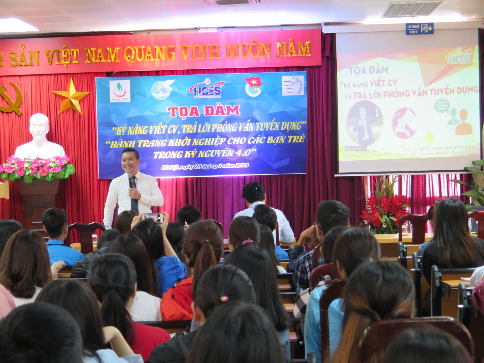 Tham gia phiên giao dịch việc làm chuyên đề thanh niên năm 2018 có sự hiện diện của đồng chí Nguyễn Hồng Dân – Phó Giám đốc Sở Lao động thương binh xã hội Thành phố Hà Nội, đồng chí Nguyễn Ngọc Việt – Phó Bí thư Thành Đoàn Hà Nội, Chủ tịch hội Thanh niên Việt Nam Thành phố Hà Nội, đồng chí Nguyễn Phi Long – Phó Trưởng phòng Công tác sinh viên – Học viện Phụ nữ Việt Nam, các sinh viên khóa 2 và 3 của học viện cùng đông đảo các doanh nghiệp và người lao động trên địa bàn thành phố Hà Nội.