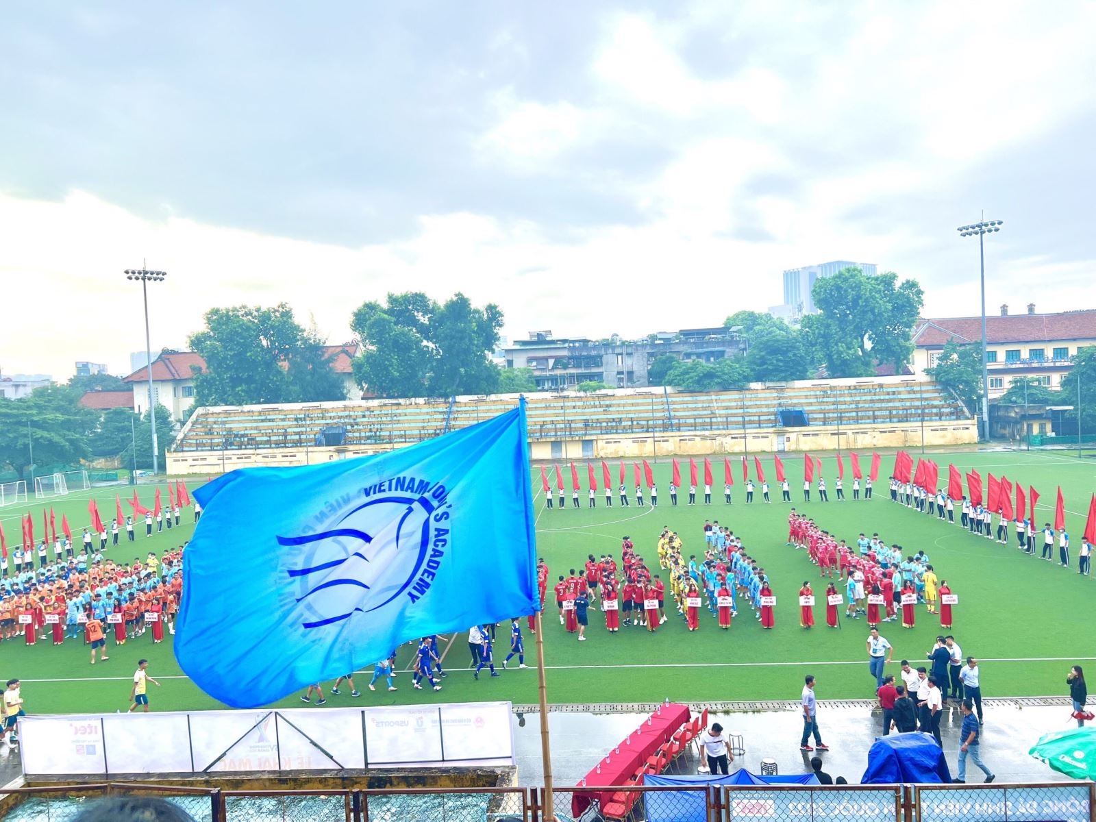 Lá cờ mang logo của Học viện Phụ nữ Việt Nam tung bay trong buổi lễ khai mạc