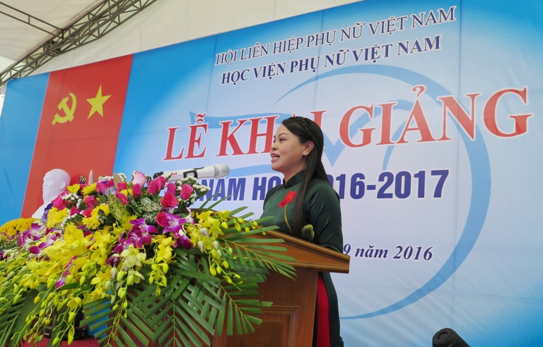 Phát biểu tại buổi lễ, Ủy viên Ban chấp hành TW Đảng, Chủ tịch Hội LHPNVN Nguyễn Thị Thu Hà bày tỏ niềm  xúc động khi được trở lại ngôi trường đã có rất nhiều kỉ niệm gắn bó. Chủ tịch đã biểu dương những thành tích đã đạt được của Học viện Phụ nữ Việt Nam trong năm học 2015 – 2016. Đặc biệt là sự thành công của đợt tuyển sinh năm 2016 đã khẳng định vị trí của Học viện Phụ nữ Việt Nam trong làng đại học nước nhà. Chủ tịch Nguyễn Thị Thu Hà chúc học viện đón một năm học mới với nhiều thay đổi tích cực, triệt để trong việc nâng cao chất lượng dạy và học, đáp ứng yêu cầu đổi mới căn bản, toàn diện giáo dục như tinh thần Nghị quyết 29 của BCH TW Đảng đã đề ra; xứng đáng là trung tâm nghiên cứu và đào tạo của Hội LHPN Việt Nam – tổ chức chăm lo, bảo vệ quyền lợi hợp pháp, chính đáng cho phụ nữ. Đặc biệt, chủ tịch nhiệt liệt chào đón và chúc 594 tân sinh viên có quãng thời gian học tập ý nghĩa xứng đáng với những tháng năm tuổi trẻ tại học viện. Kết thúc bài phát biểu, chủ tịch Nguyễn Thị Thu Hà không quên bày tỏ sự tin tưởng, hi vọng vào sự phát triển mạnh mẽ và vững chắc của Học viện Phụ nữ Việt Nam trong thời gian tới.