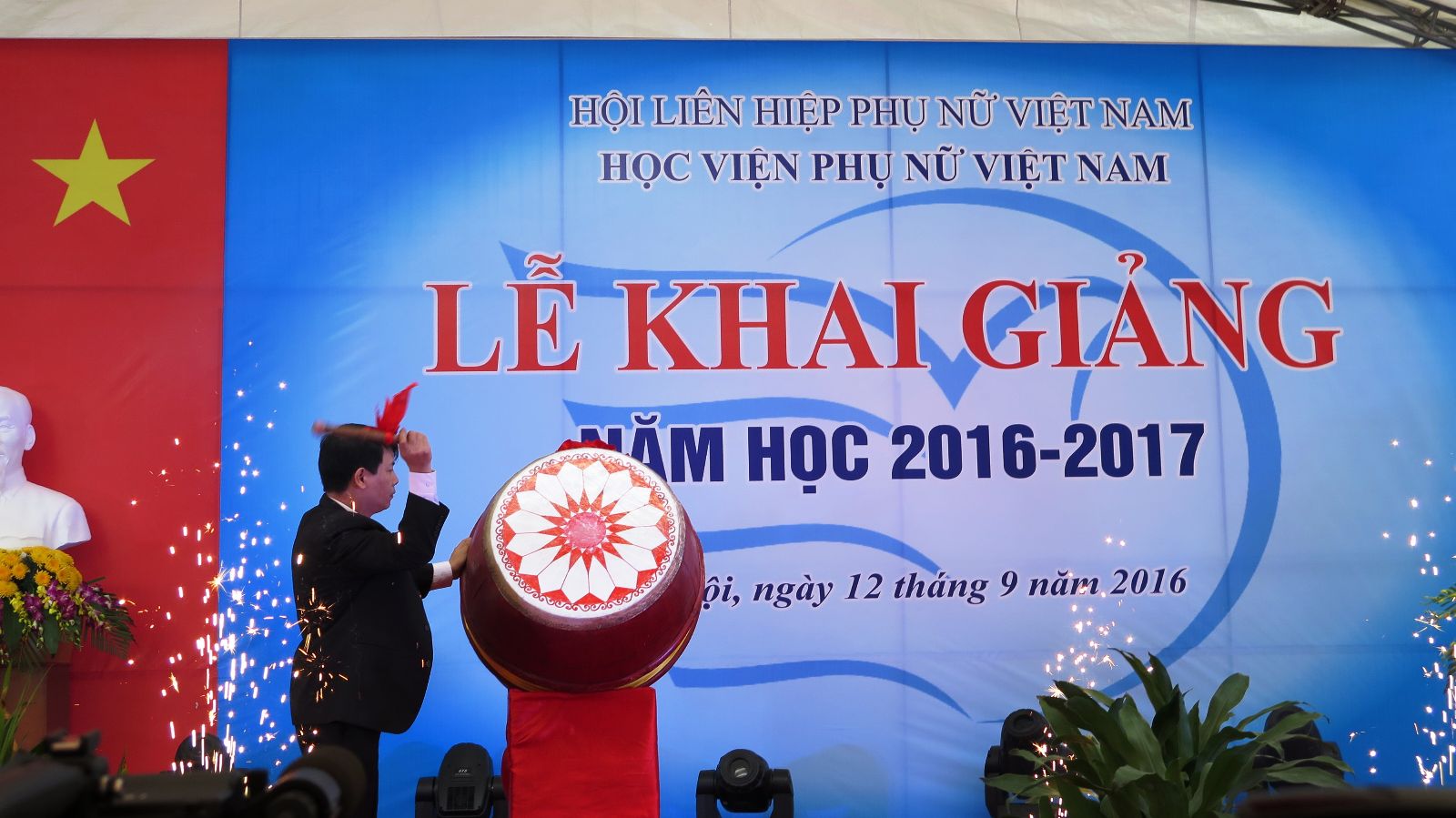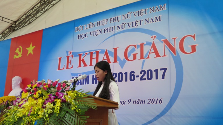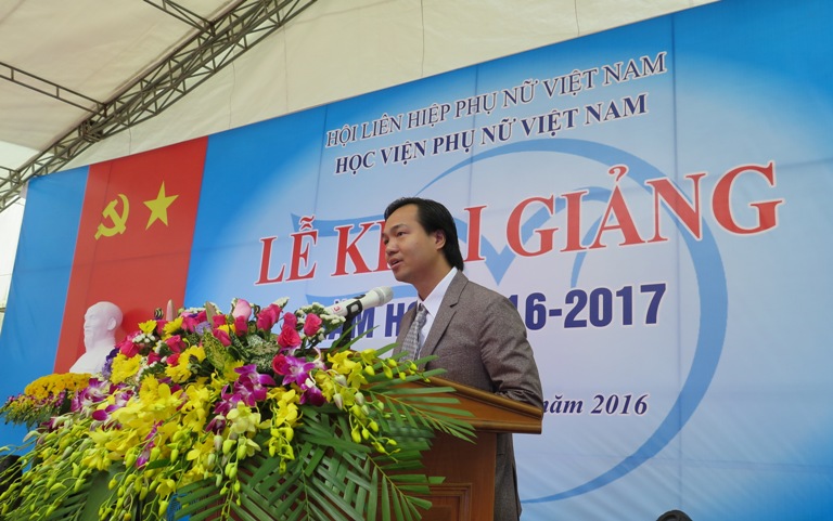Sau phần chào cờ, TS. Trần Quang Tiến – Giám đốc Học viện Phụ nữ Việt Nam đã phát biểu khai mạc lễ khai giảng năm học 2016 – 2017. Giám đốc gửi đến các đồng chí lãnh đạo, các vị khách quý đại diện Trung ương Hội, các Bộ, ban, ngành, các trường đại học lời chào mừng nồng nhiệt. Thay mặt Học viện, TS. Trần Quang Tiến cũng gửi lời chúc mừng đến 594 tân sinh viên, những người đã chọn Học viện là nơi rèn đức luyện tài vì ngày mai lập nghiệp.