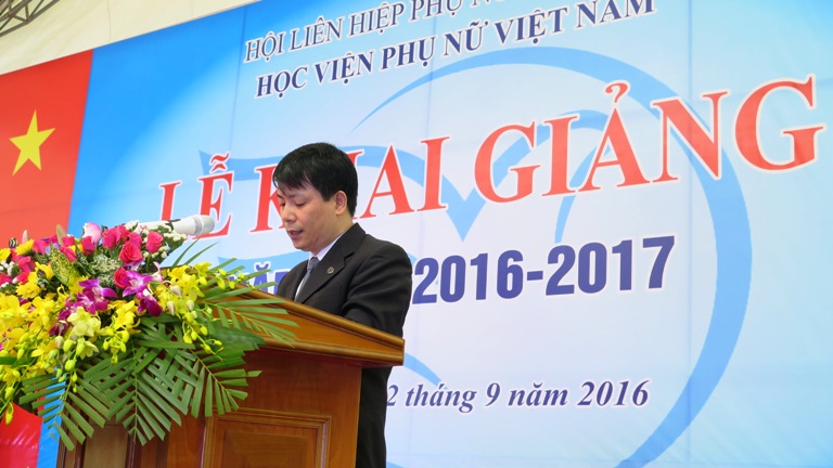.jpg) TS. Trần Quang Tiến đã điểm lại các thành tích nổi bật trong công tác của toàn thể các đơn vị, cán bộ công nhân viên, học sinh, sinh viên Nhà trường năm học vừa qua. Việc tổ chức đào tạo đại học, trung cấp, bồi dưỡng cán bộ Hội LHPN các cấp, công tác nghiên cứu khoa học, công tác xây dựng, ban hành hệ thống quy chế, quy định đều được tập trung đẩy mạnh. Từ những kết quả tích cực trên tất cả các mặt, nhất là kết quả tuyển sinh đủ chỉ tiêu ngay trong đợt I năm 2016  vừa diễn ra; có thể khẳng định: Học viện Phụ nữ Việt Nam đã và đang xây dựng được hình ảnh, vị thế của mình là một cơ sở giáo dục đại học có tổ chức giảng dạy nghiêm túc, không ngừng đổi mới, nâng cao chất lượng đào tạo và đáp ứng nhu cầu của người học. Giám đốc cũng nêu lên các định hướng trọng tâm trong năm học 2016-2017 và chiến lược phát triển tiếp theo của Nhà trường, bày tỏ mong muốn trong năm học mới, toàn thể cán bộ, giảng viên, nhân viên và toàn thể các em học sinh, sinh viên trong trường cùng đồng lòng, chung tay, chung sức vì sự phát triển bền vững của Học viện Phụ nữ Việt Nam và góp phần đáp ứng nhu cầu nguồn nhân lực chất lượng cao thời kỳ hội nhập, phát triển sự nghiệp giáo dục đào tạo chung của đất nước.