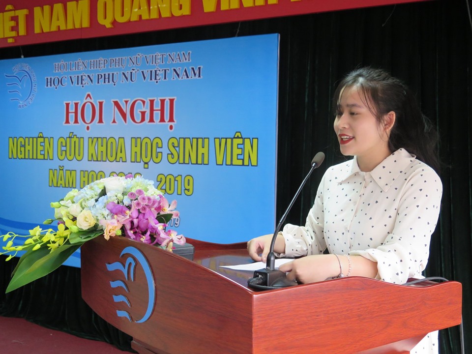 Đại diện các nhóm nghiên cứu, sinh viên Đặng Phương Hoa đã gửi lời cảm ơn sự quan tâm, hỗ trợ của Ban Giám đốc, Viên Nghiên cứu Phụ nữ và đặc biệt là sự hướng dẫn nhiệt tình, động viên kịp thời của các thầy cô hướng dẫn. Bạn Đặng Phương Hoa cũng chia sẻ với các bạn sinh viên về những trải nghiệm ý nghĩa khi tham gia nghiên cứu khoa học nhằm tạo động lực cho các bạn đăng ký đề tài nghiên cứu trong năm học 2019 – 2020.