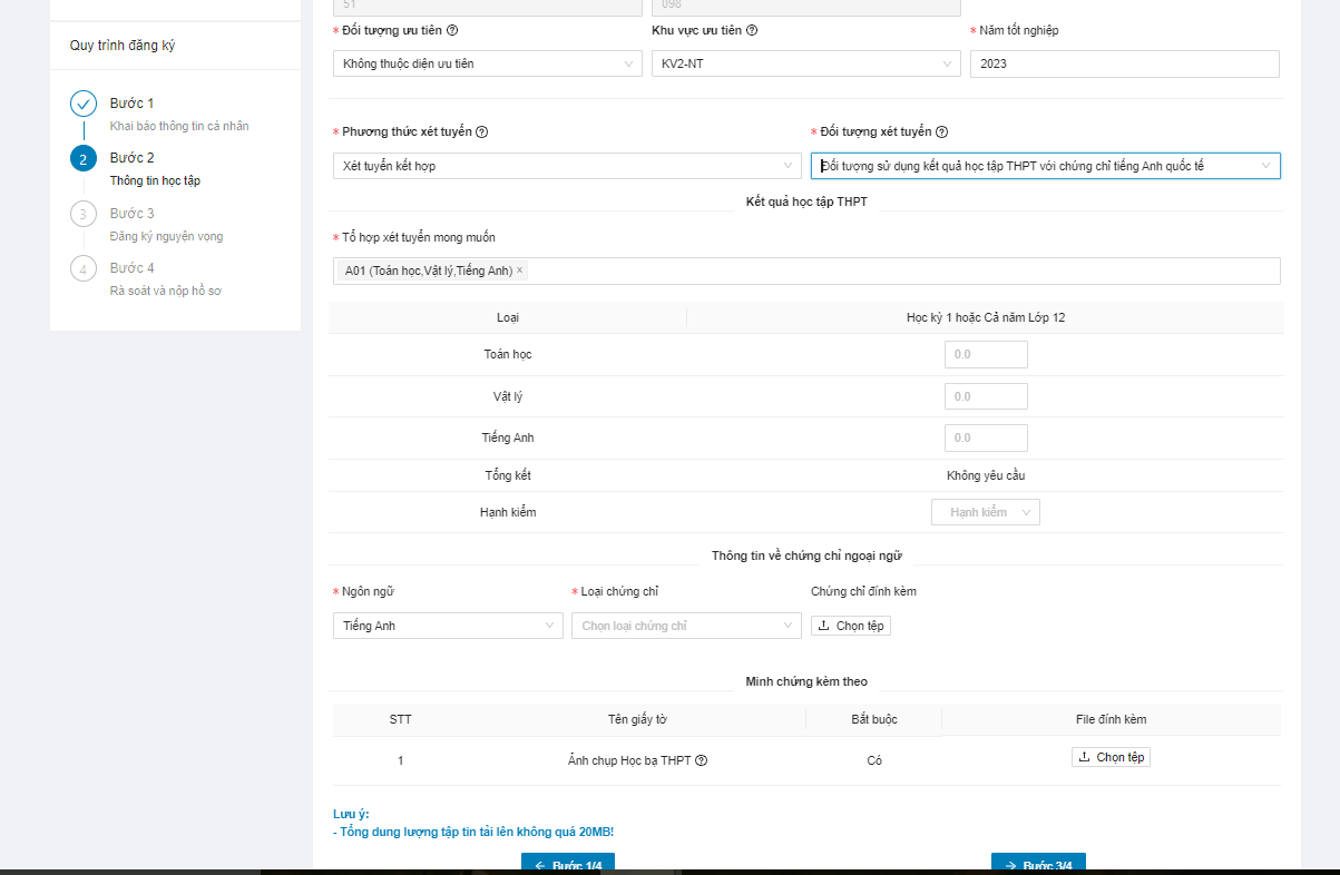 Đối với thí sinh có sử dụng phương thức kết hợp điểm học tập THPT và chứng chỉ tiếng Anh thì sẽ khai các thông tin về chứng chỉ và kèm hình ảnh minh chứng về chứng chỉ.