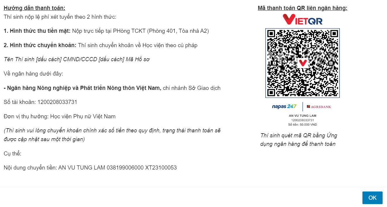 Bước 13: Thí sinh xem hướng dẫn thanh toán thì nhấn nút Xem Thông tin thanh toán và sẽ hiện ra bảng dưới đây. Bảng hiển thị Lệ phí của thí sinh phải thanh toán và nội dung thanh toán (Đối với thí sinh chuyển khoản liên Ngân hàng). Thí sinh lưu ý soạn đúng theo Nội dung mà Học viện đã soạn sẵn để có Học viện dễ dàng đối soát hoặc thí sinh quét QR code trên ứng dụng Mobile banking để thanh toán lệ phí xét tuyển. Thí sinh chụp màn hình hoặc lưu biên lai thu lệ phí để có căn cứ khi Học viện cần đối chứng.