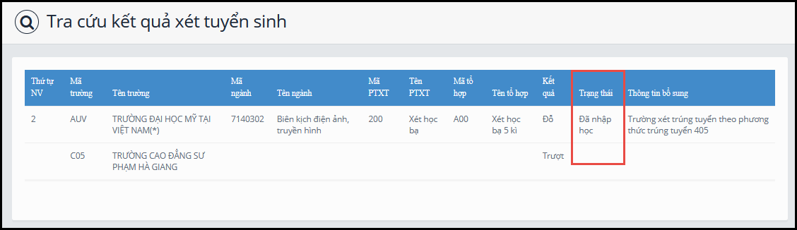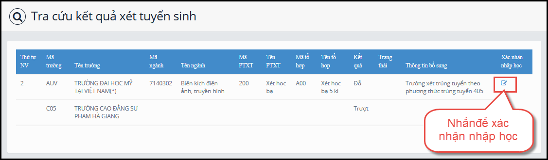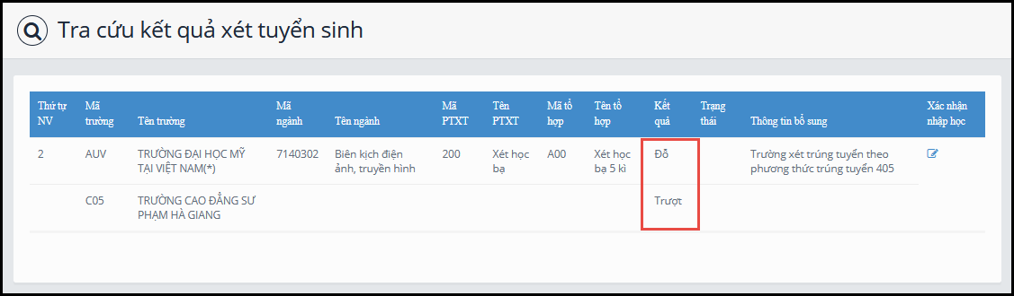 Nếu kết quả là Trượt có nghĩa là thí sinh trượt tất cả các nguyện vọng đã đăng ký vào trường.