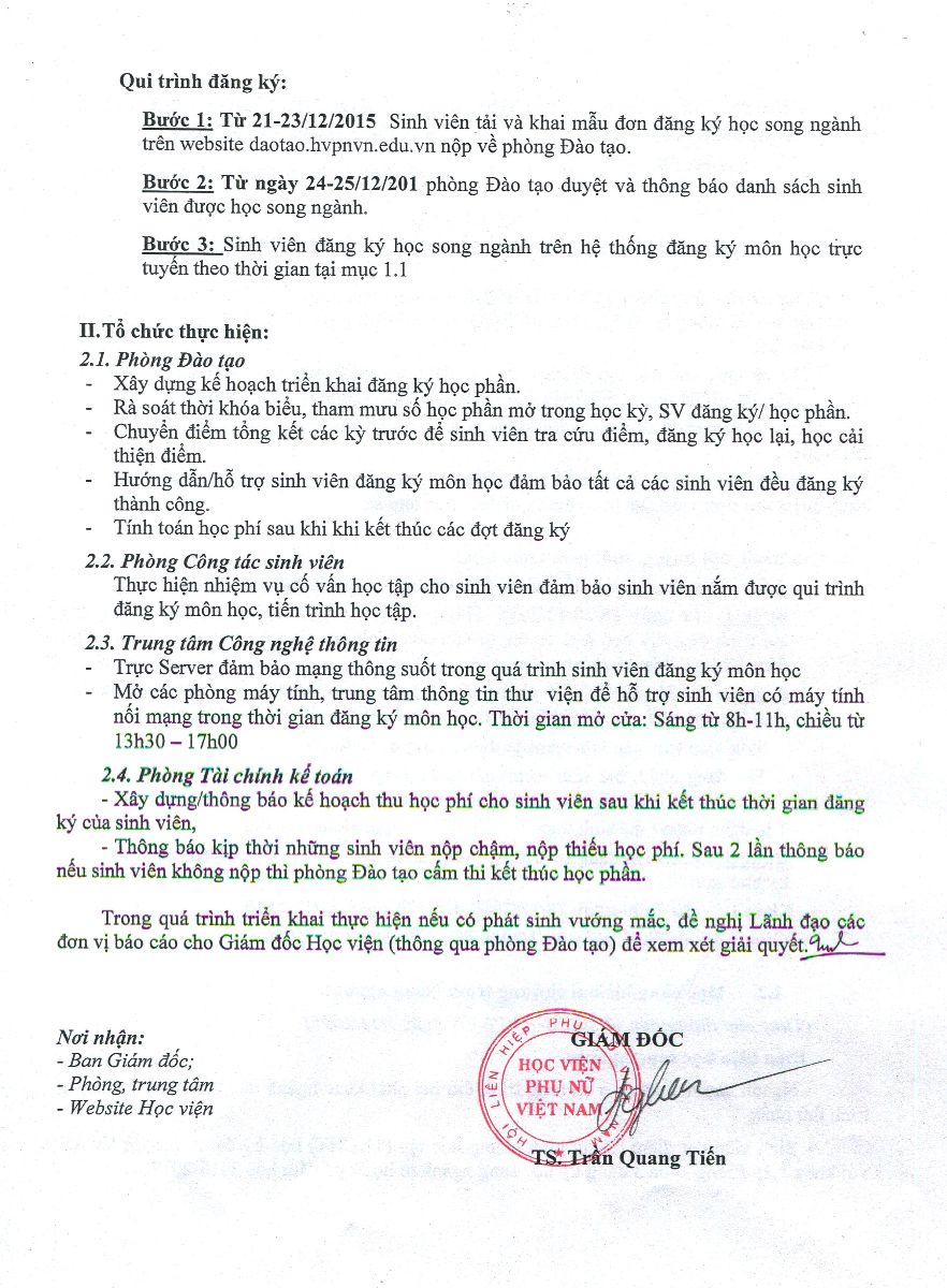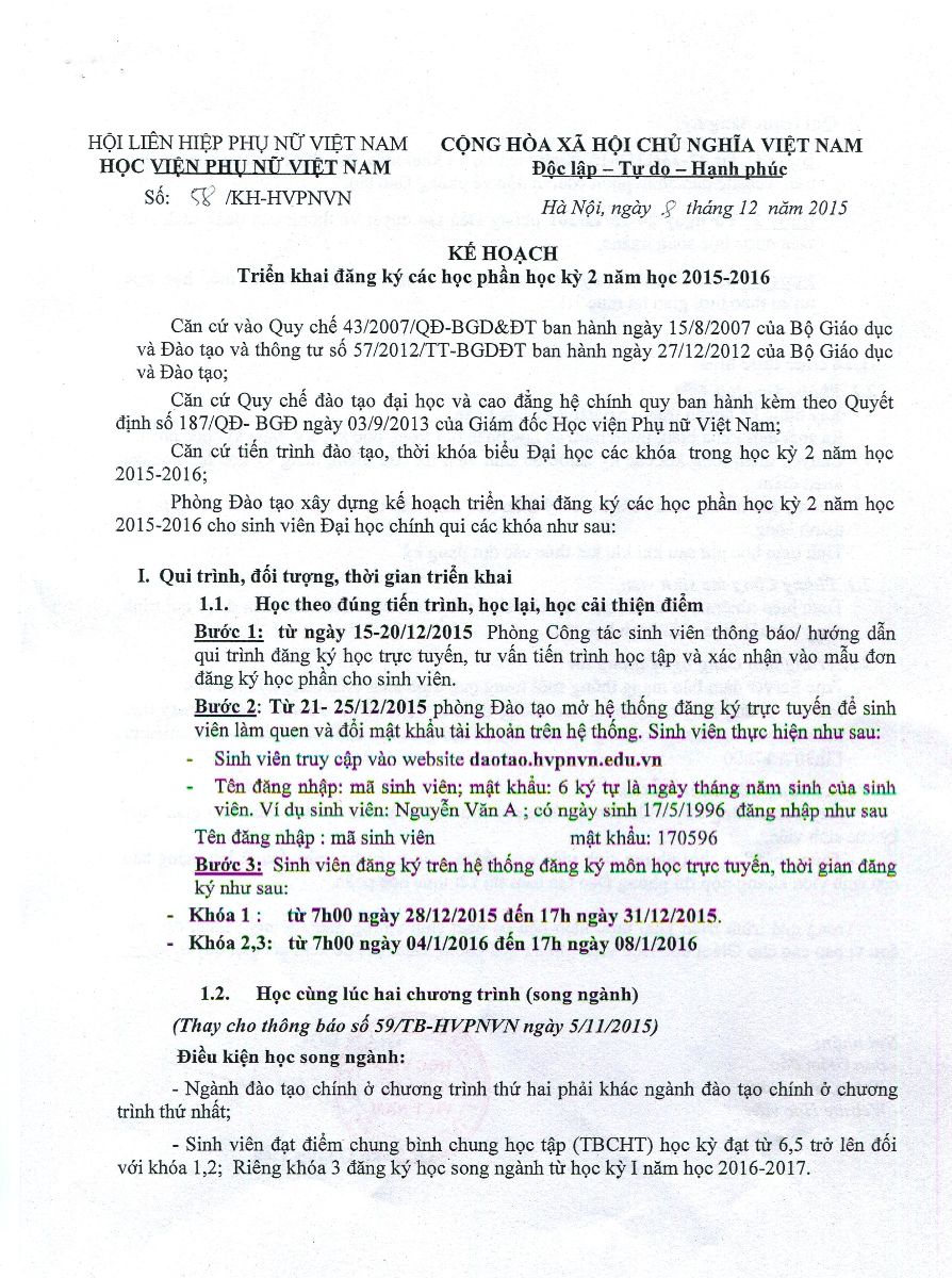 Kế hoạch triển khai đăng ký học phần kỳ 2 năm học 2015-2016