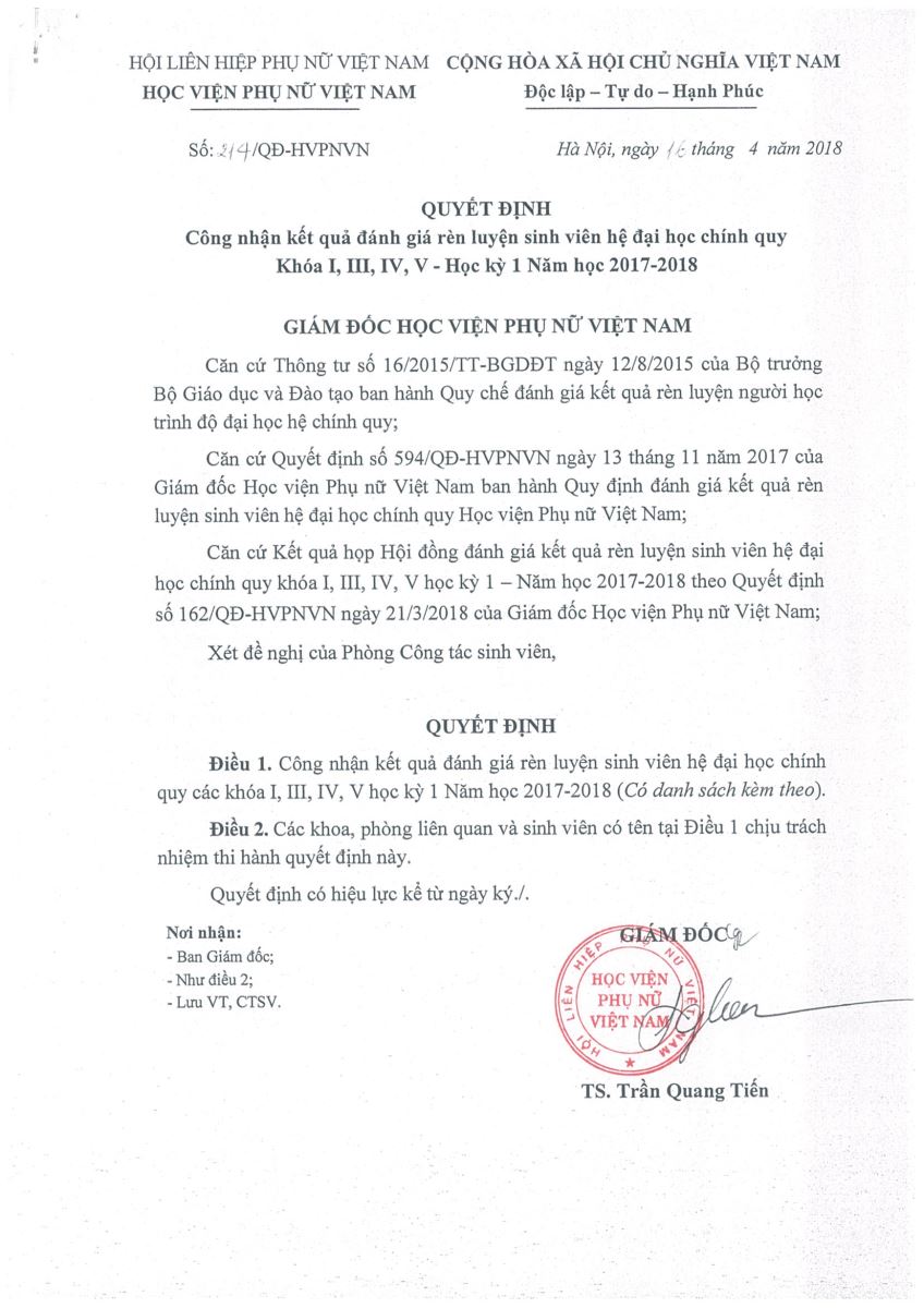 Kết quả đánh giá rèn luyện sinh viên HK I năm học 2017 – 2018