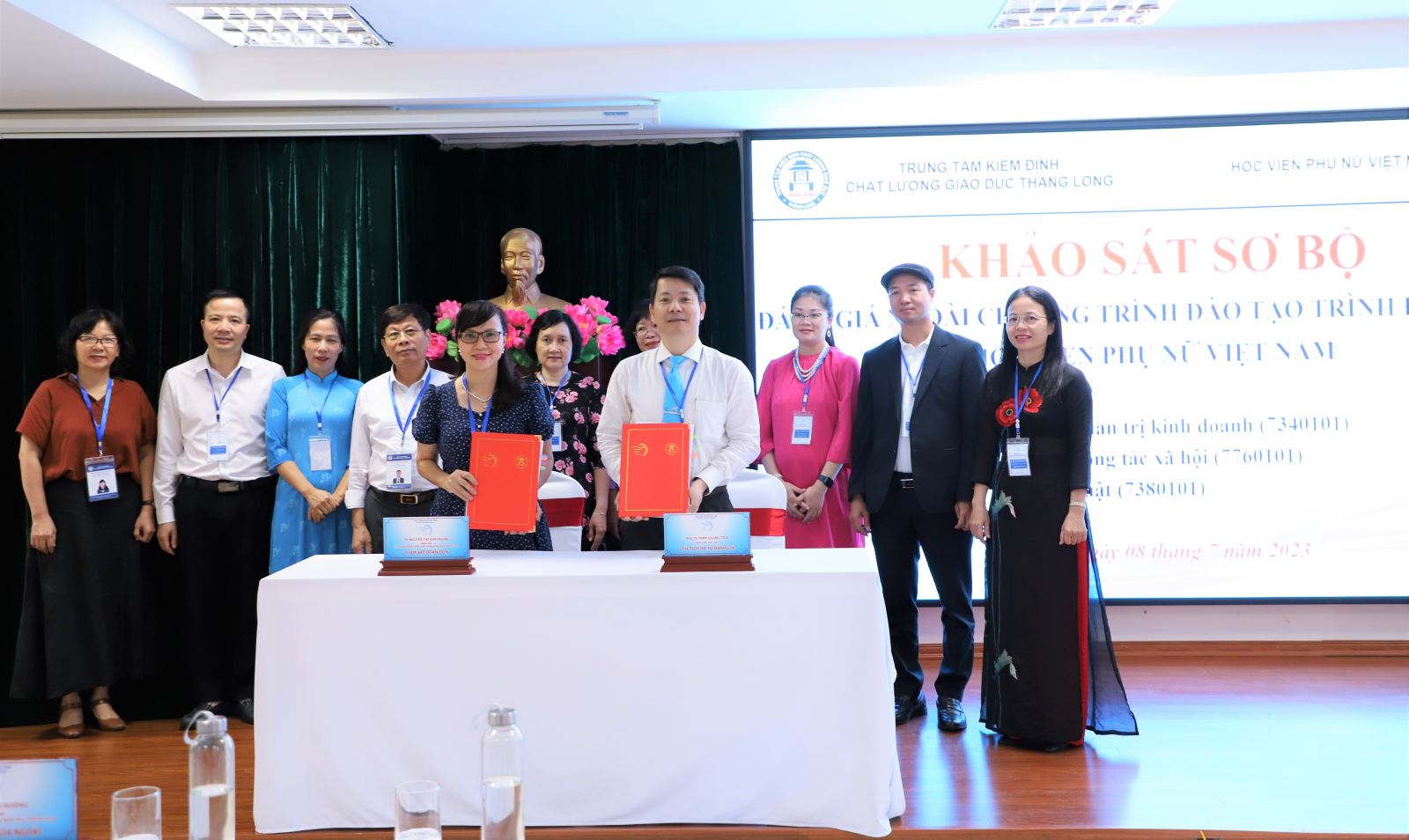 Sau khi thảo luận về kết quả nghiên cứu/kiểm tra hồ sơ tự đánh giá chương trình đào tạo trình độ đại học ngành Quản trị kinh doanh; Công tác xã hội; Luật; và các điều kiện chuẩn bị cho khảo sát chính thức, hai bên đã thông qua nội dung Biên bản ghi nhớ sau buổi khảo sát sơ bộ. Đại diện Đoàn đánh giá ngoài, Học viện Phụ nữ Việt Nam và Trung tâm Kiểm định Chất lượng Giáo dục Thăng Long đã ký kết biên bản ghi nhớ.