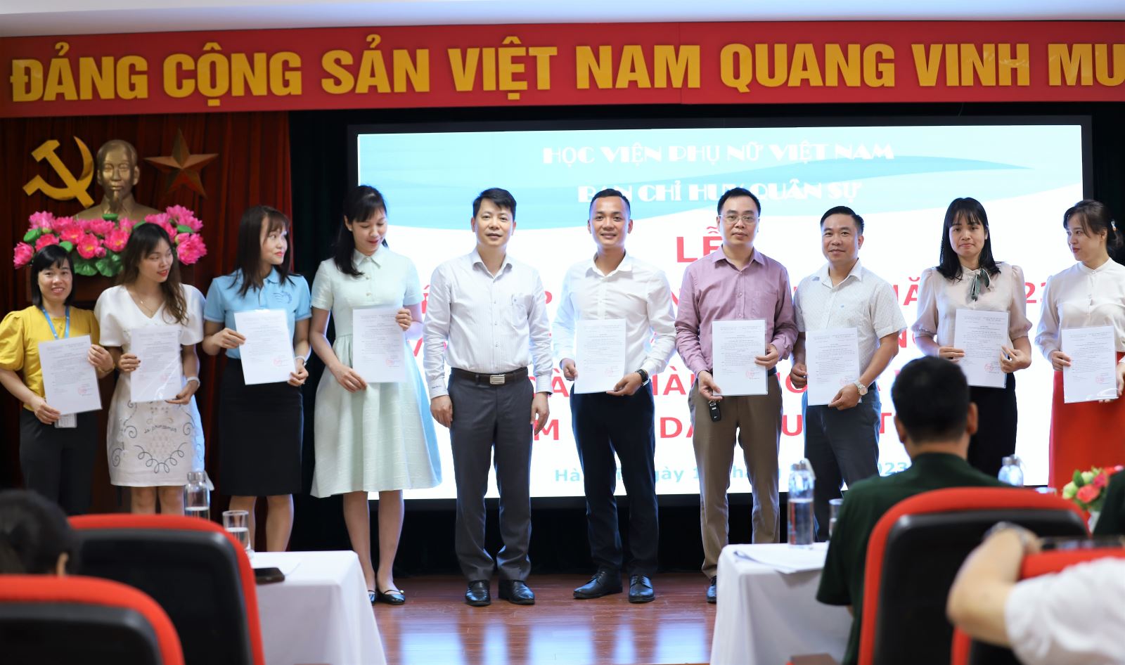 Tham dự buổi lễ về phía Học viện Phụ nữ Việt Nam có PGS.TS. Trần Quang Tiến – Bí thư Đảng uỷ – Giám đốc Học viện Phụ nữ Việt Nam; ThS. Hà Thị Thanh Vân – Phó Giám đốc, Chỉ huy trưởng Ban Chỉ huy quân sự Học viện cùng các đồng chí thuộc đội dân quân tự vệ của Học viện Phụ nữ Việt Nam. Về phía Ban Chỉ huy quân sự Quận Đống Đa có sự tham dự của Trung tá Nguyễn Thìn Bảo, Cán bộ Chính trị và Thiếu tá Lê Văn Tuấn, Trợ lý Dân quân tự vệ.