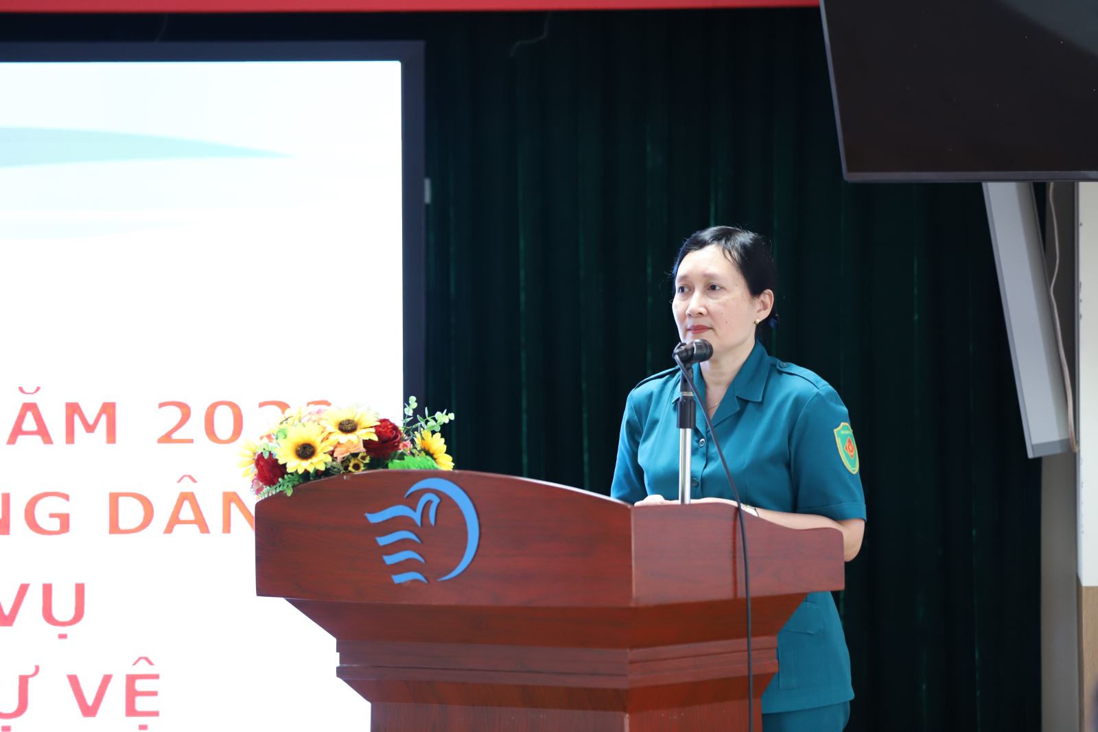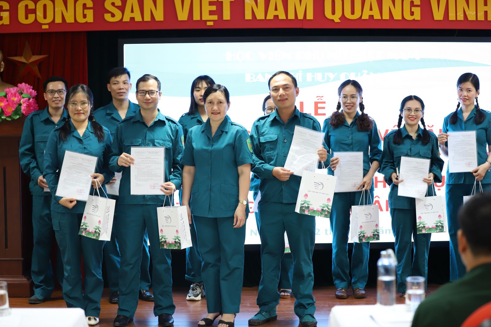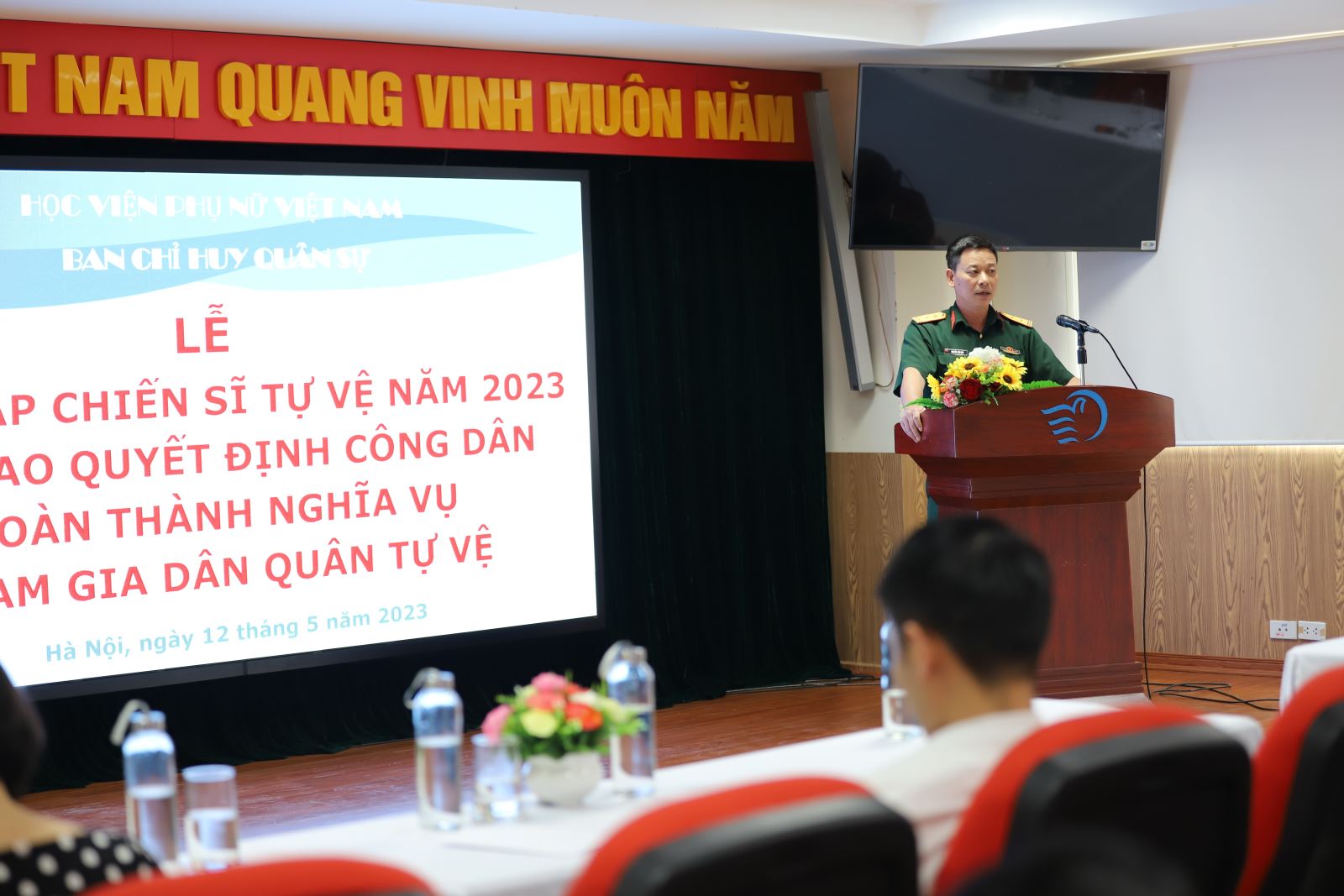 Đại diện Ban Chỉ huy quân sự Quận Đống Đa, Trung tá Nguyễn Thìn Bảo chúc mừng các chiến sĩ đã hoàn thành nghĩa vụ và mới được giao nhiệm vụ tham gia đội tự vệ Học viện Phụ nữ Việt Nam. Đồng chí cũng biểu dương những đóng góp, thành tích của Ban chỉ huy Quân sự Học viện đạt được trong thời gian qua và tin tưởng và tinh thần nỗ lực hoàn thành tốt nhiệm vụ được giao của toàn đội trong thời gian tới.