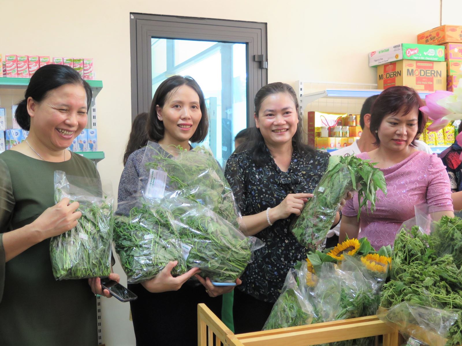 Bà Đỗ Thị Thu Thảo – Phó Chủ tịch Hội LHPN Việt Nam (áo hoa đen thứ 2 từ phải sang) và cán bộ TW Hội LHPN Việt Nam tham quan và mua sản phẩm của WEmart