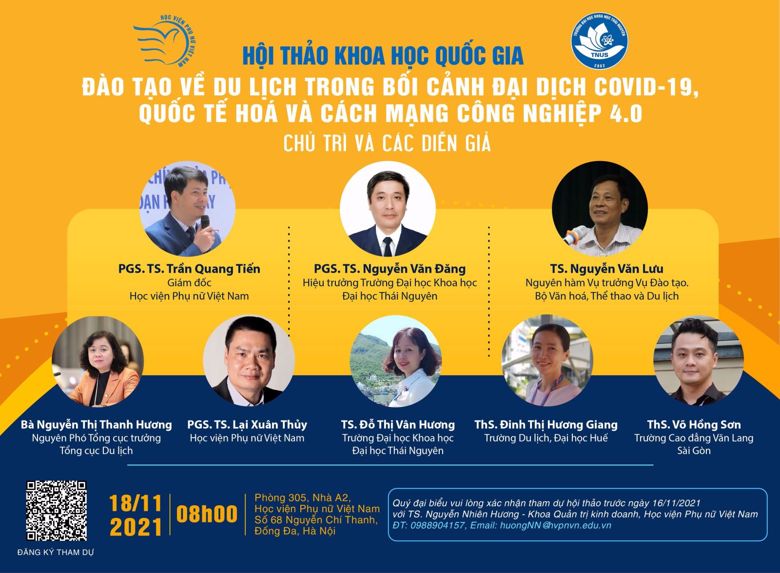 Nhằm chia sẻ các kết quả nghiên cứu khoa học liên quan hoạt động đào tạo đại học các ngành du lịch cũng như các yếu tố tác động tích cực và tiêu cực đến hoạt động này, tập trung những vấn đề chính như đại dịch Covid-19, quốc tế hoá và giáo dục đại học 4.0, sáng ngày 18/11/2021, Học viện Phụ nữ Việt Nam sẽ phối hợp với Trường Đại học Khoa học – Đại học Thái Nguyên với sự tham gia của các cơ sở giáo dục đại học về du lịch trong cả nước tổ chức hội thảo khoa học quốc gia với chủ đề: ‘Đào tạo về du lịch trong bối cảnh đại dịch Covid-19, Quốc tế hoá và CMCN lần thứ tư‘