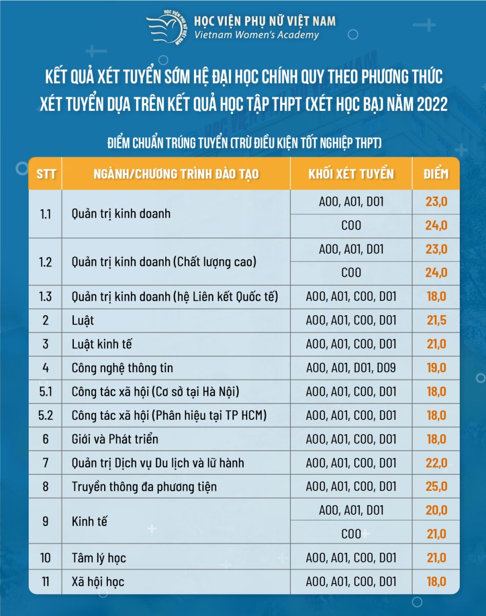 Ngày 29/07/2022, Học viện Phụ nữ Việt Nam thông báo ngưỡng điểm nhận hồ sơ xét tuyển theo kết quả thi tốt nghiệp THPT năm 2022 (xét tuyển theo tổ hợp) hệ đại học chính quy năm 2022.
