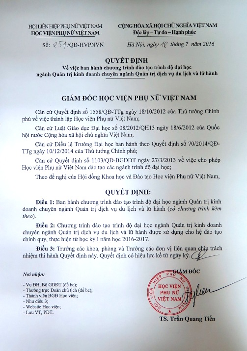 Quyết định ban hành chương trình đào tạo ngành QTKD chuyên ngành Quản trị dịch vụ du lịch và lữ hành