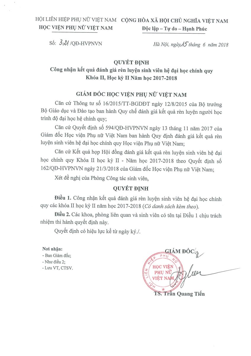 Quyết định công nhận kết quả đánh giá rèn luyện sinh viên khóa II