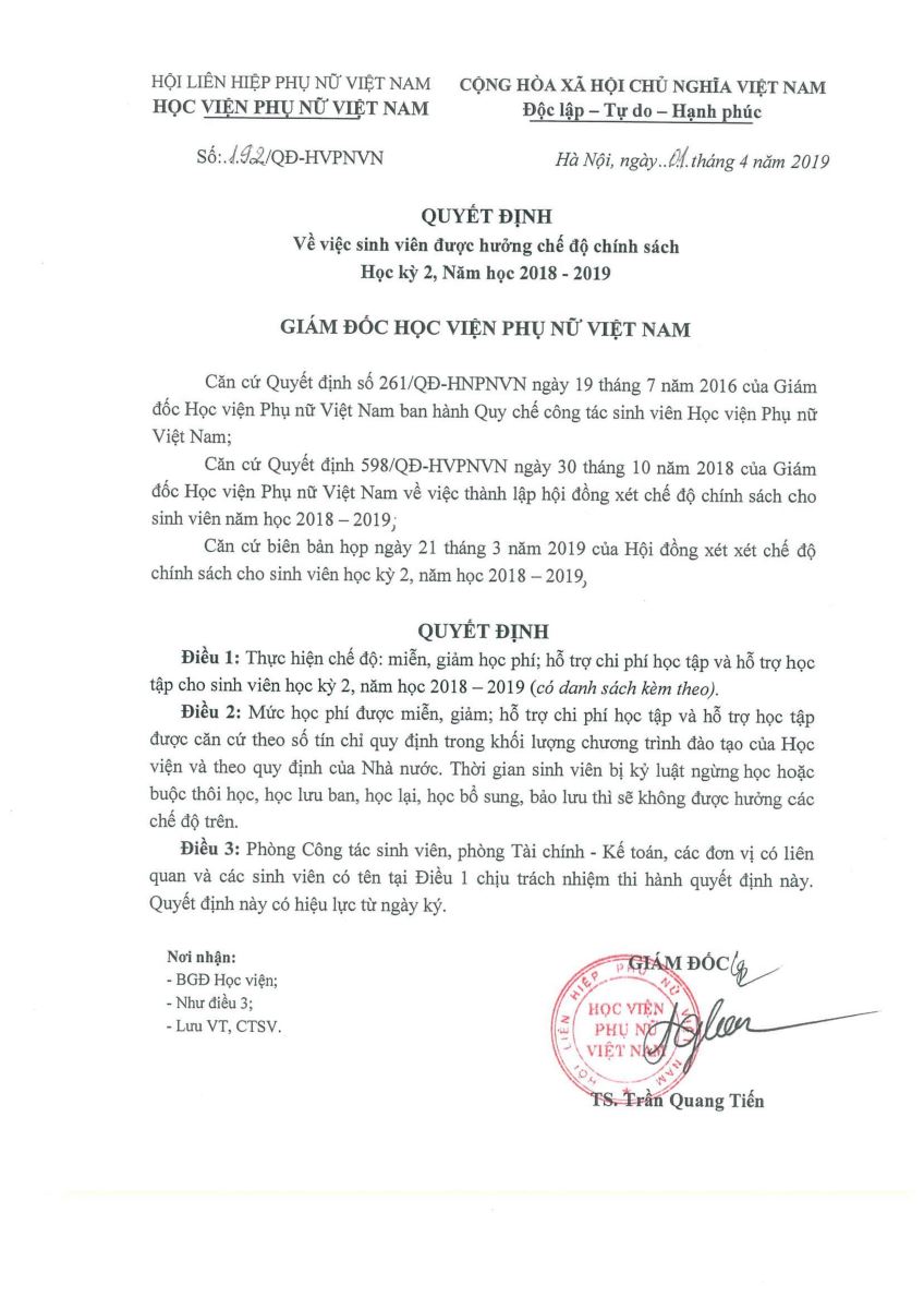 Tin tứcQuyết định về việc sinh viên được hưởng chế độ chính sách HKII, năm học 2018 – 2019 Posted on Tháng Tư 3, 2019 by admin(full) 03 Th4 DS sinh viên hưởng chế độ hỗ trợ học tập DS sinh viên hưởng chế độ hỗ trợ chi phí học tập DS sinh viên hưởng chế độ miễn giảm học phí admin(full) Thông báo về việc trông giữ phương tiện đi lại trong khuôn viên Học việnQuyết định ban hành chuẩn đầu ra chương trình đào tạo Thạc sỹ QTKD