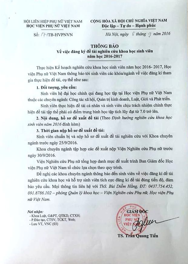 Thông báo đăng ký Đề tài nghiên cứu khoa học sinh viên năm học 2016 - 2017.