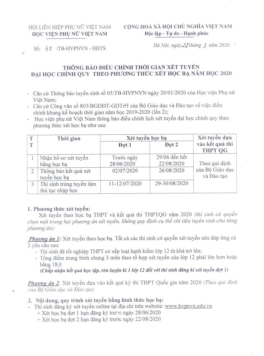 Tin tứcThông báo điều chỉnh thời gian xét tuyển đại học năm 2020 Posted on Tháng Ba 27, 2020 by admin(full) 27 Th3 admin(full) Học viện Phụ nữ Việt Nam ứng dụng phương pháp đào tạo trực tuyến trong điều kiện phòng, chống dịch Covid-19Thông báo gia hạn thu học phí và hỗ trợ SV học trực tuyến