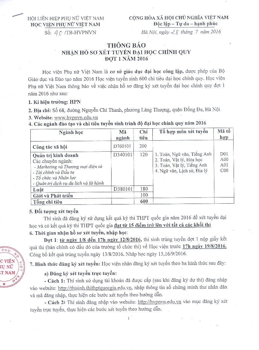 THÔNG BÁO NHẬN HỒ SƠ XÉT TUYỂN ĐẠI HỌC 2016