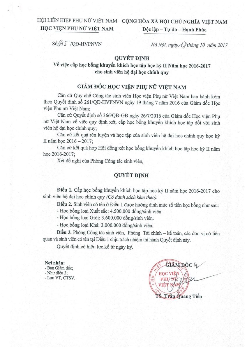Tin tứcThông báo Quyết định cấp học bổng khuyến khích học kỳ II năm học 2016 – 2017 Posted on Tháng Mười 19, 2017 by admin(full) 19 Th10 Download Danh sách sinh viên nhận học bổng TẠI ĐÂY admin(full) Thư mời viết bài đăng Tạp chí khoa học số 1 – Học viện Phụ nữ Việt Nam Lễ công bố Quyết định của Đoàn Chủ tịch Hội Liên hiệp Phụ nữ Việt Nam bổ nhiệm Phó Giám đốc Học viện Phụ nữ Việt Nam