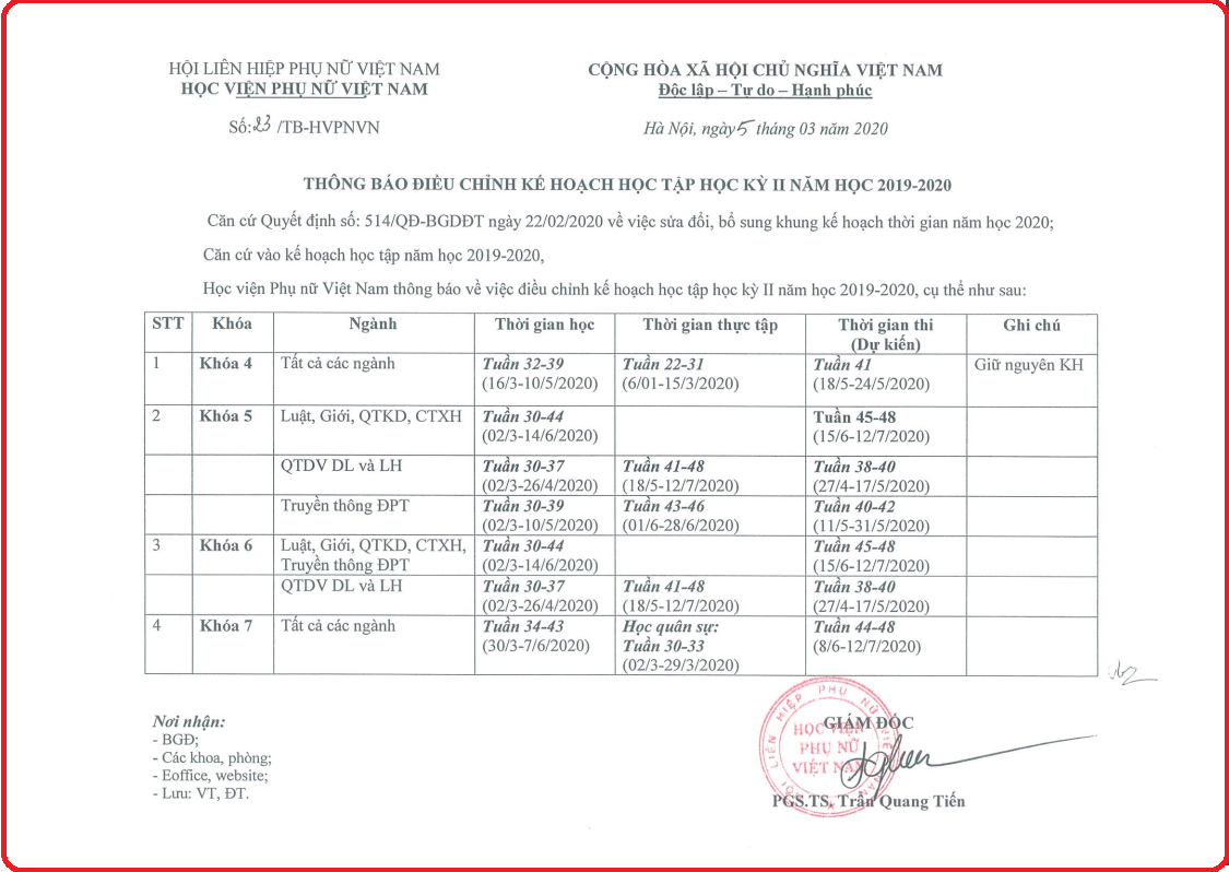 Tin tứcThông báo về việc điều chỉnh kế hoạch học tập HK 2 năm học 2019 – 2020 Posted on Tháng Ba 6, 2020 by admin(full) 06 Th3 admin(full) Thông báo thu học phí kỳ 2 năm học 2019 – 2020Học viện Phụ nữ Việt Nam hưởng ứng tuần lễ Áo dài