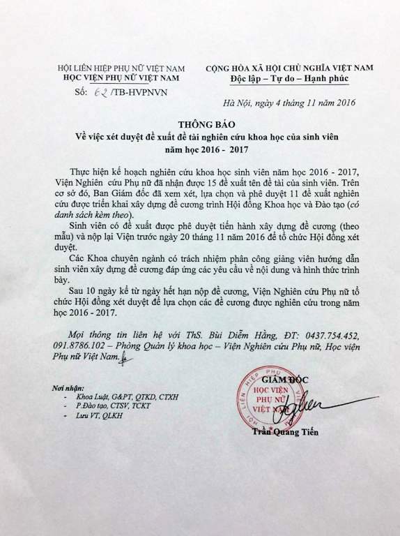 Thông báo về việc xét duyệt đề tài NCKH của sinh viên năm học 2016 - 2017