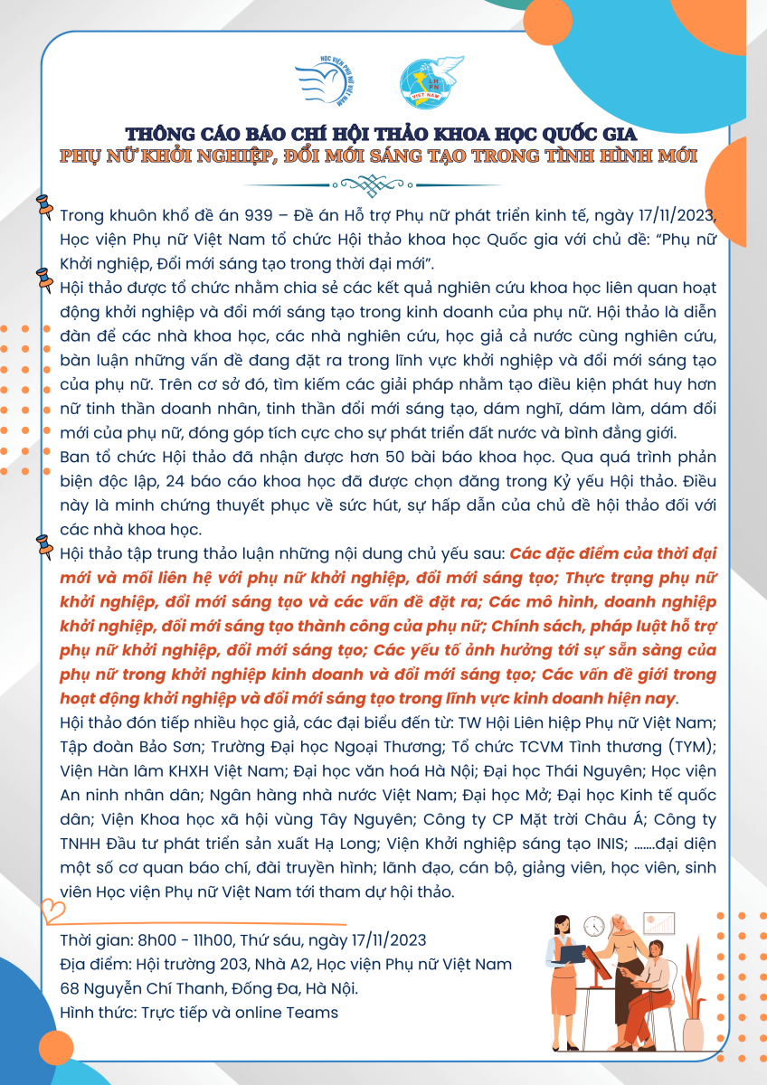 Nhằm chia sẻ các kết quả nghiên cứu khoa học liên quan hoạt động khởi nghiệp và đổi mới sáng tạo trong kinh doanh của phụ nữ, sáng ngày 17/11/2023, Học viện Phụ nữ Việt Nam tổ chức Hội thảo khoa học Quốc gia với chủ đề: “Phụ nữ Khởi nghiệp, Đổi mới sáng tạo trong thời đại mới”. Hội thảo nằm trong khuôn khổ đề án 939 – Đề án “Hỗ trợ phụ nữ khởi nghiệp giai đoạn 2017 – 2025” do Thủ tướng Chính phủ phê duyệt ngày 30/6/2017.
