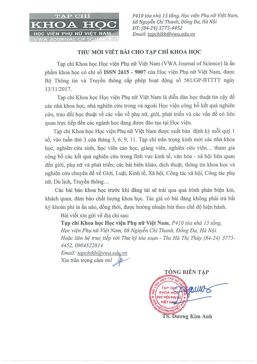 Thư mời viết bài cộng tác Tạp chí Khoa học Học viện Phụ nữ Việt Nam