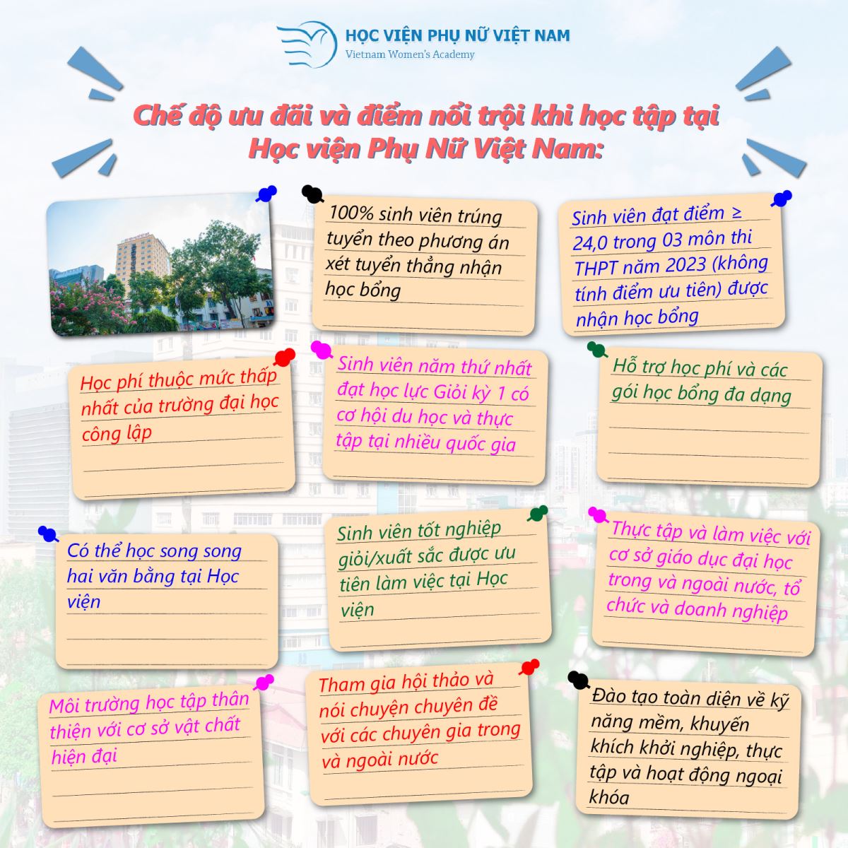 Học viện Phụ nữ Việt Nam (Học viện) là cơ sở giáo dục đại học công lập đạt chuẩn kiểm định chất lượng giáo dục quốc gia. Năm 2023, Học viện Phụ nữ Việt Nam thông báo tuyển sinh 10 ngành đại học chính quy bao gồm: Ngành Quản trị kinh doanh; Luật; Luật kinh tế; Công nghệ thông tin; Công tác xã hội; Giới và phát triển; Quản trị Dịch vụ Du lịch và lữ hành; Truyền thông đa phương tiện; Kinh tế; Tâm lý học.