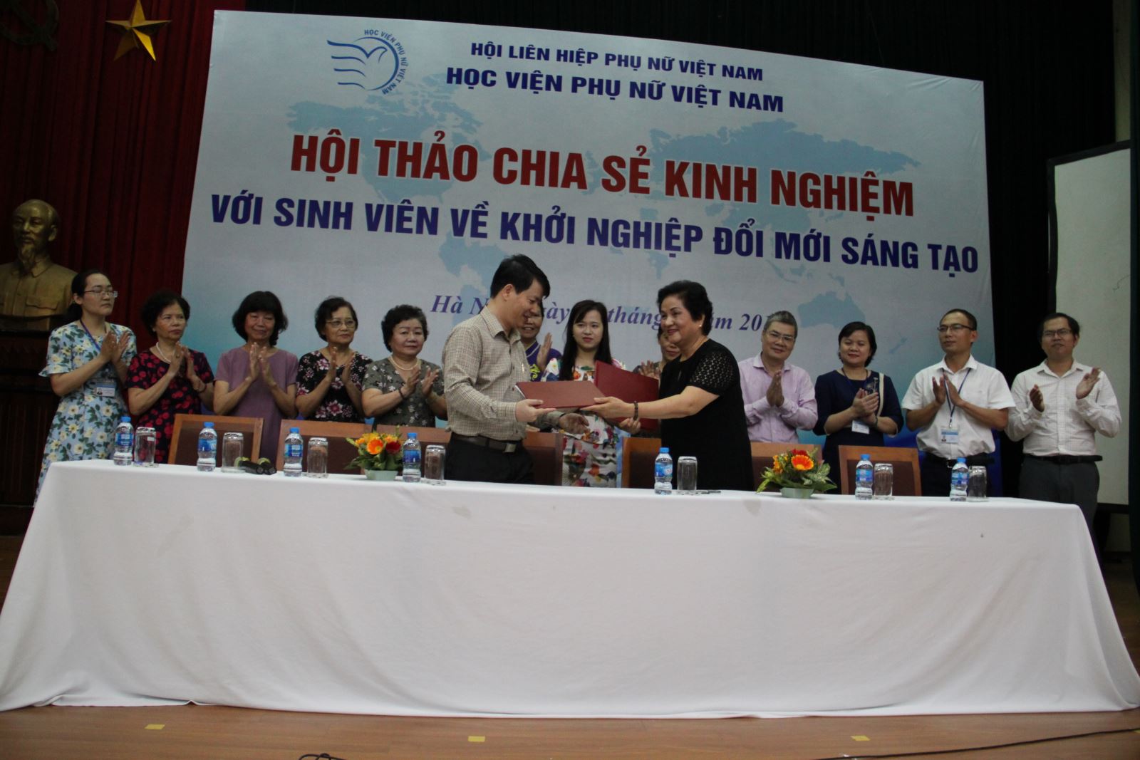 Nhân dịp này, TS. Trần Quang Tiến và bà Mai Thị Thùy đã ký kết hợp tác giữa Học viện Phụ nữ Việt Nam với Hiệp hội nữ DNNVV TP Hà Nội.