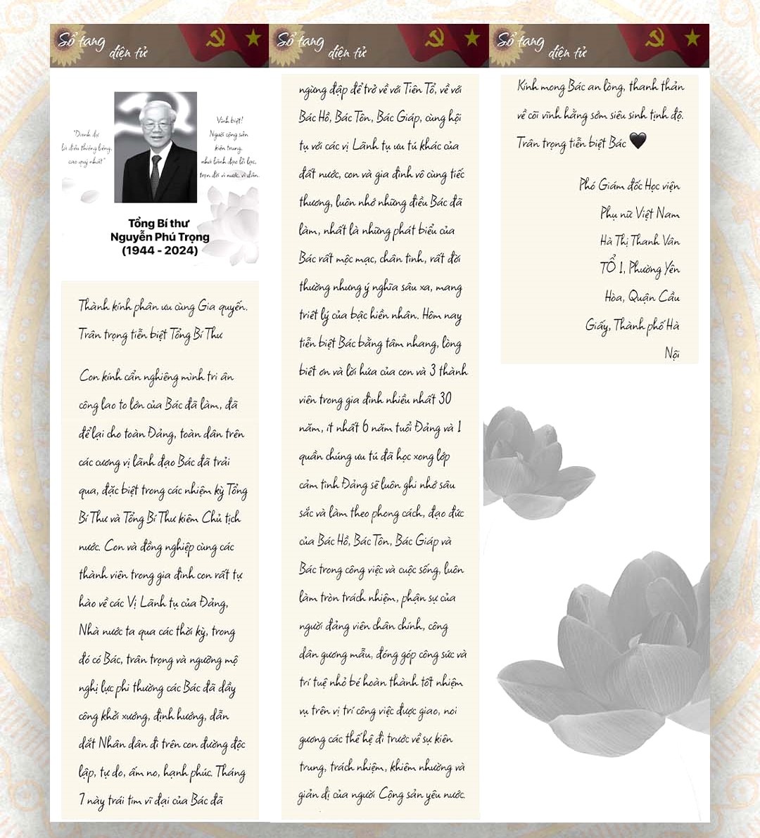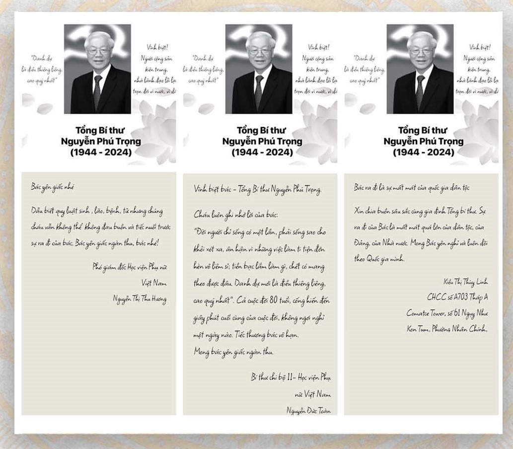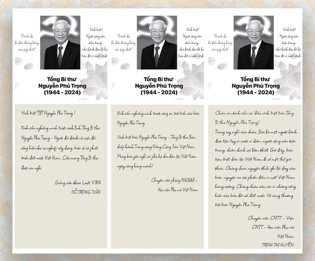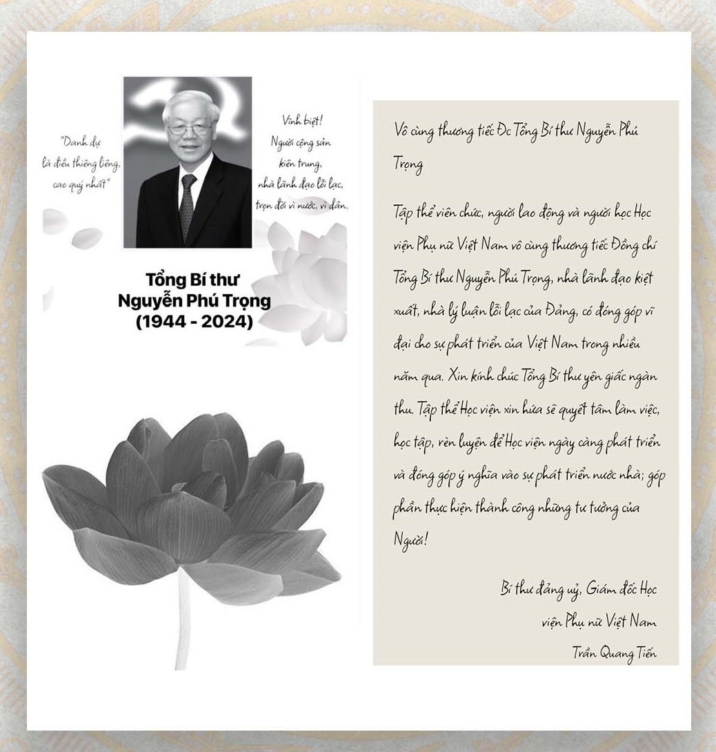 Trong giờ phút thiêng liêng tiễn biệt Tổng Bí thư, thành kính chia buồn cùng gia đình Bác Nguyễn Phú Trọng, không có điều kiện trực tiếp dự tang lễ, thông qua sổ tang điện tử, viên chức, người lao động Học viện Phụ nữ Việt Nam đều có chung niềm xúc động và thành tâm tri ân “Nhân gian trao một kiếp người. Chức nghiệp trọn vẹn, cuộc đời yên vui. Sinh ly, tử biệt bùi ngùi. Hôm nay Bác đã về nơi cửu tuyền. Sống hiền hậu, thác quy tiên. Chia xa con cháu, vơi duyên cuộc đời. Mong Bác yên giấc nghỉ ngơi. Siêu sinh tịnh độ thảnh thơi an nhàn”