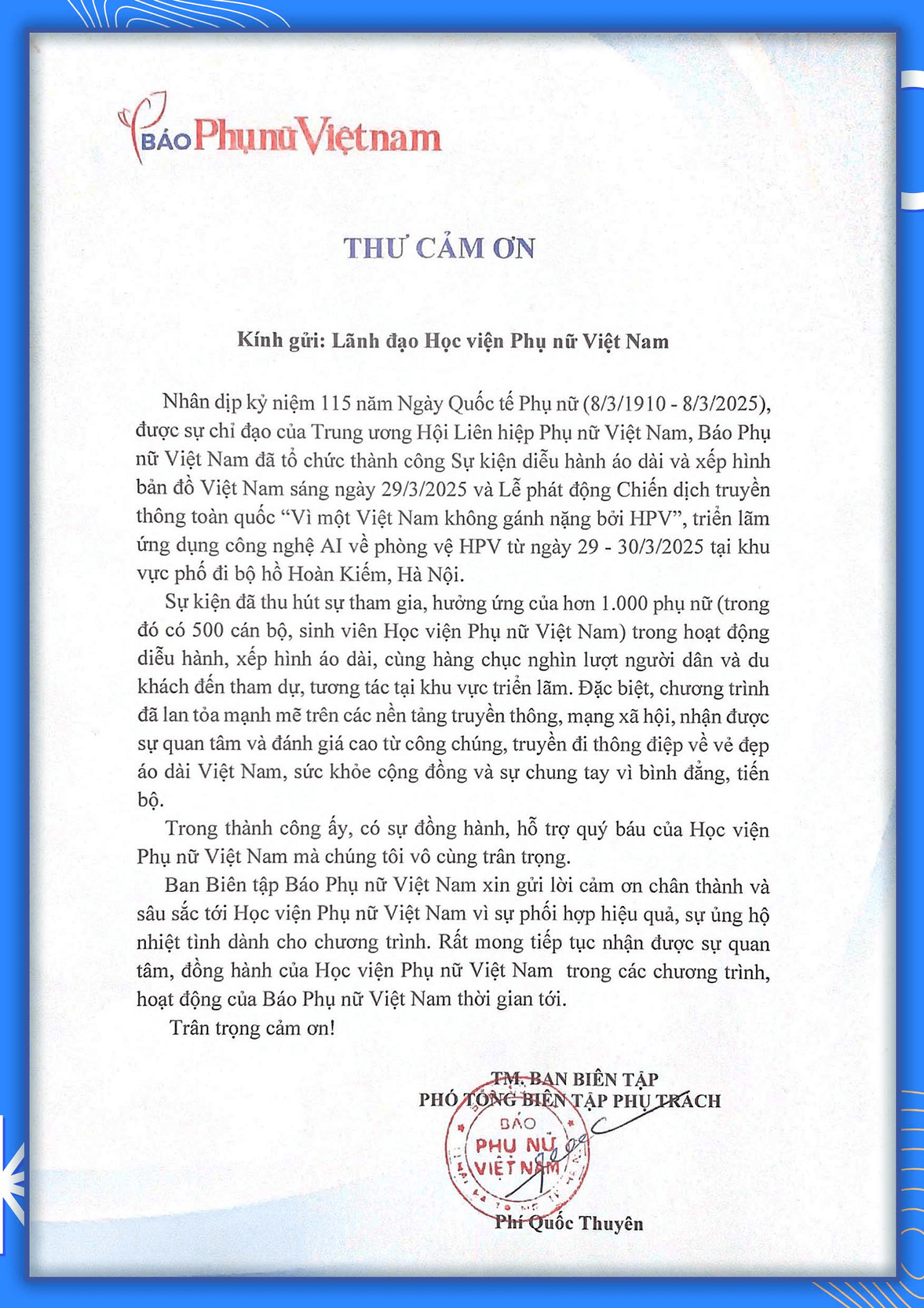 Báo Phụ nữ Việt Nam trân trọng gửi thư cảm ơn Học viện Phụ nữ Việt Nam đã phối hợp tham gia tạo nên sự thành công của sự kiện Diễu hành áo dài và xếp hình bản đồ Việt Nam diễn ra ngày 29/3/2025. Sự kiện do TW Hội Liên hiệp Phụ nữ Việt Nam chỉ đạo Báo Phụ nữ Việt Nam tổ chức nhân dịp kỉ niệm 115 năm ngày Quốc tế Phụ nữ (8/3/1910 - 8/3/2025).
